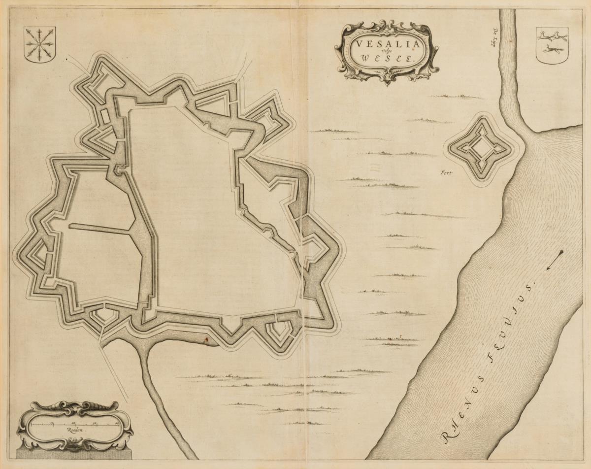 2-seitig verglastes Blatt mit Umriss der Hansestadt Wesel aus der Vogelperspektive, bezeichnet "Vesalia vulgo Wesel", verso Beschreibung in Latein, aus "Novus Atlas, Das ist Weltbeschreibung / mit schönen newen außführlichen Land-Taffeln in Kupffer gestochen und an den Tag gegeben durch Guil".