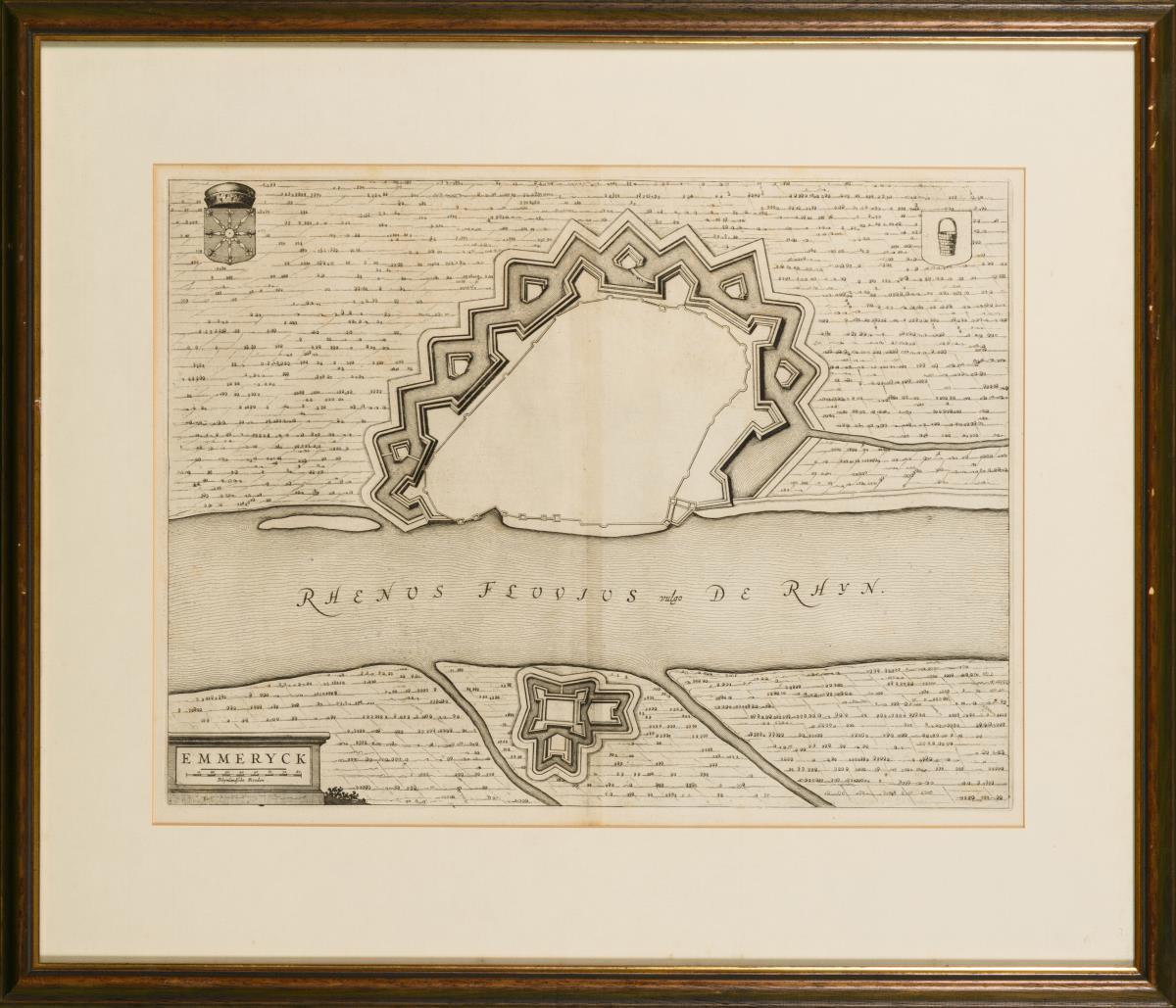 2-seitig verglastes Blatt mit Umriss der Stadt Emmerich am Rhein aus der Vogelperspektive, bezeichnet "Emmeryck", verso Beschreibung in Latein, aus "Novus Atlas, Das ist Weltbeschreibung / mit schönen newen außführlichen Land-Taffeln in Kupffer gestochen und an den Tag gegeben durch Guil". Hinterklebte Bugfalte, stockfleckig.