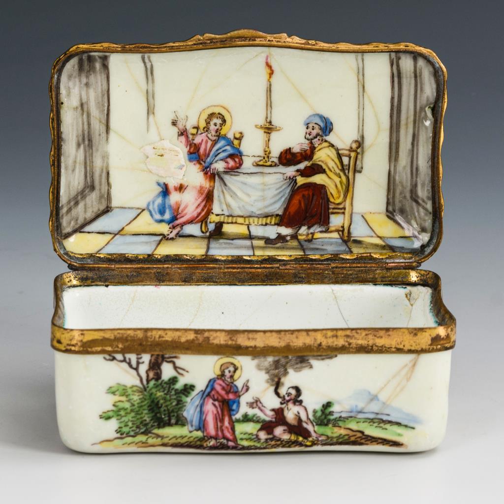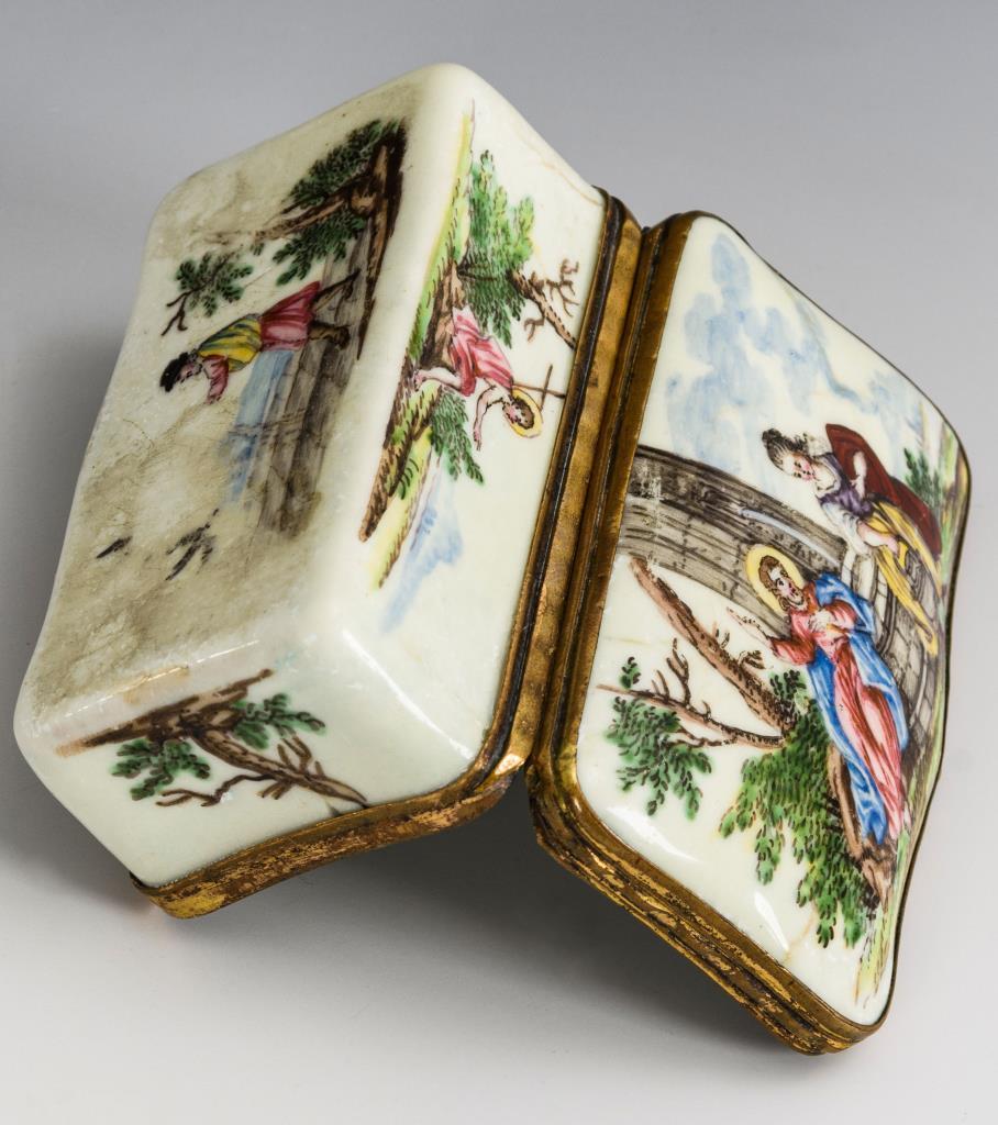 Allseits und auf dem Boden zumeist mit christlichen Motiven bemalte Quaderdose. Auf dem Deckel Christus und die Samariterin; im Deckel Christus in Emmaus. Email haarrissig und teils berieben mit wenigen Ausbesserungen.