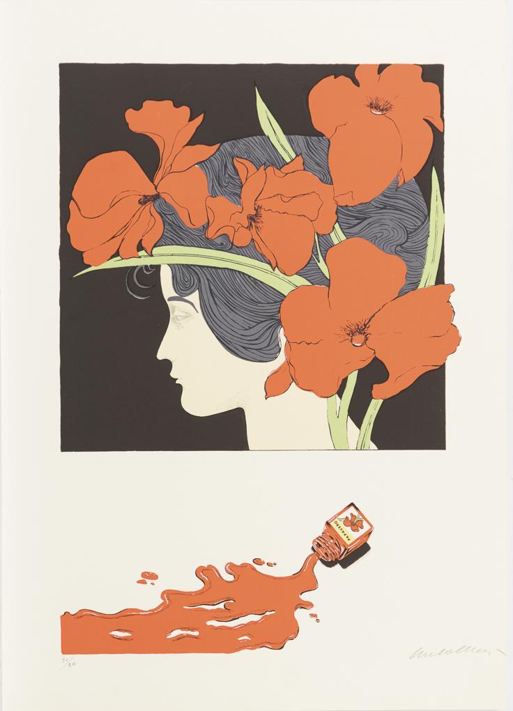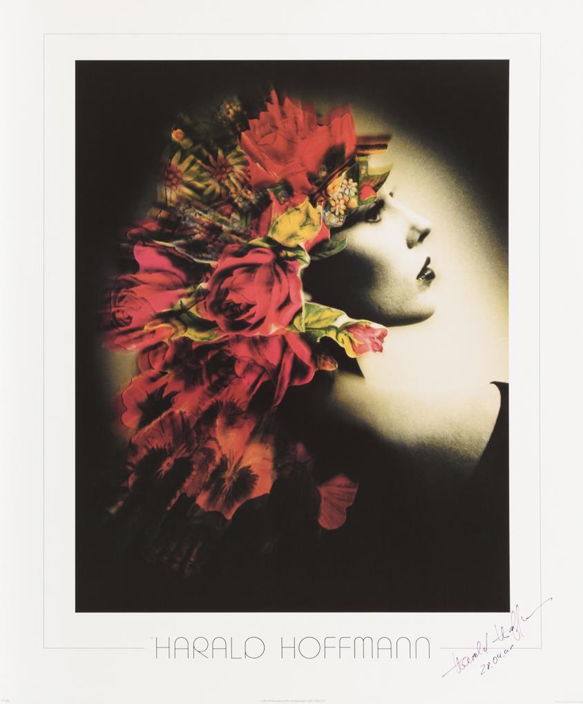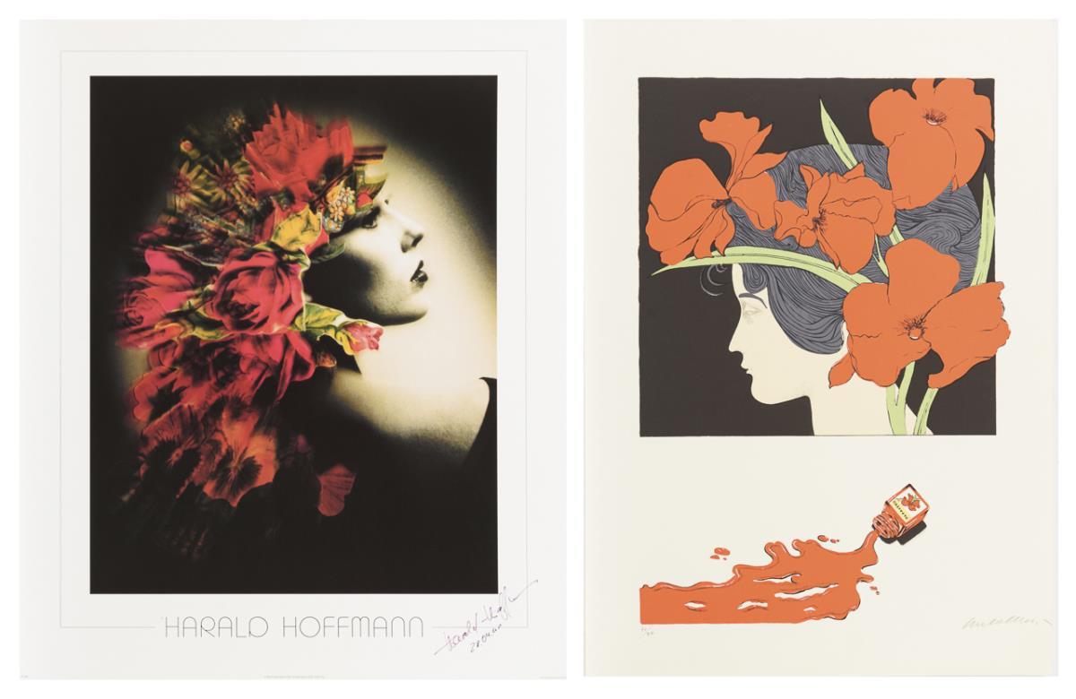 Hoffmann, Harald: Dame mit Blumenschmuck, Farboffsetdruck, Stiftsignatur und datiert: 28.04.91, Blatt: 60 x 50 cm, Copyright Biri Publications BV, Amsterdam | Undeutlich signiert: Damenkopf im Profil mit Mohnschmuck, Farblithografie, Bleistiftsignatur, Blatt: 70 x 50 cm, Exemplar: 30/80.