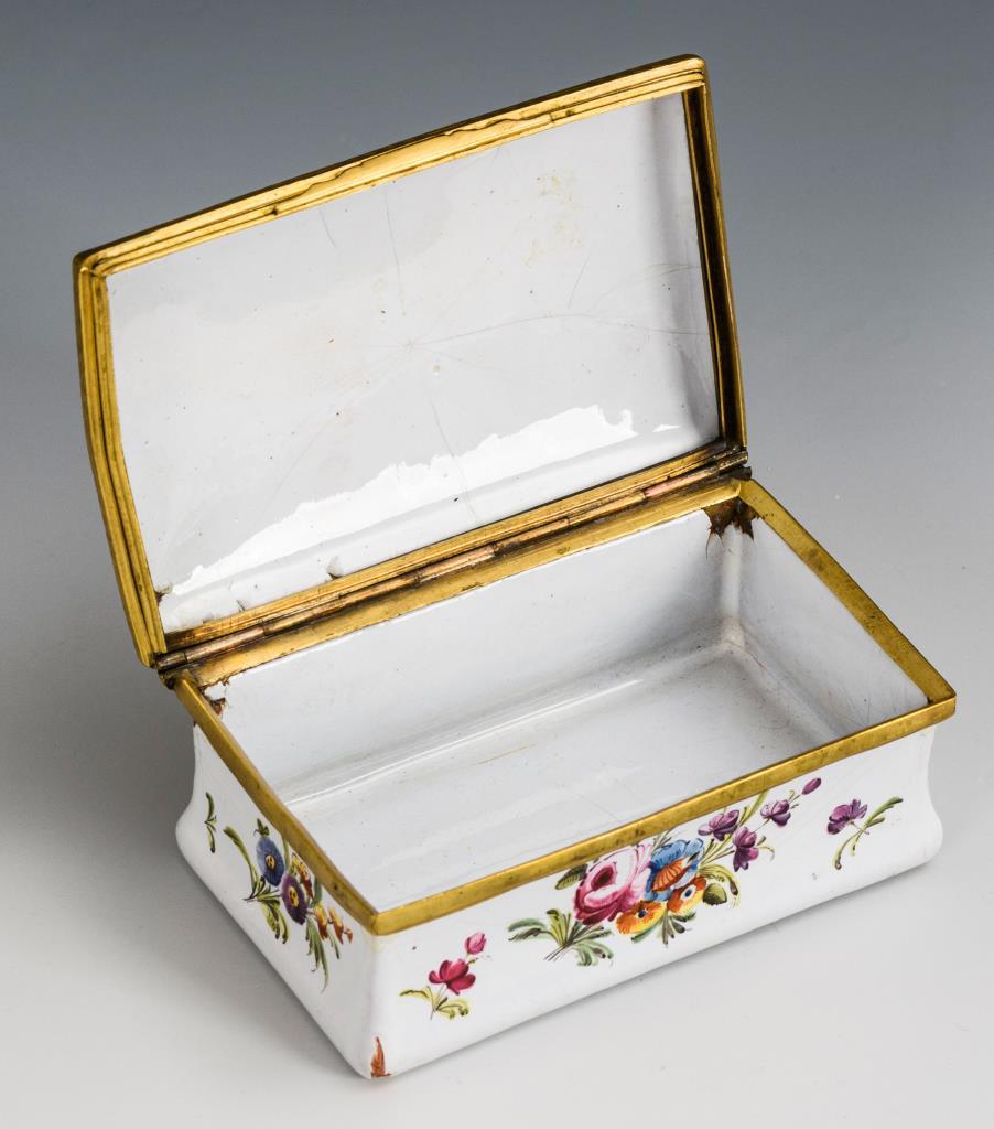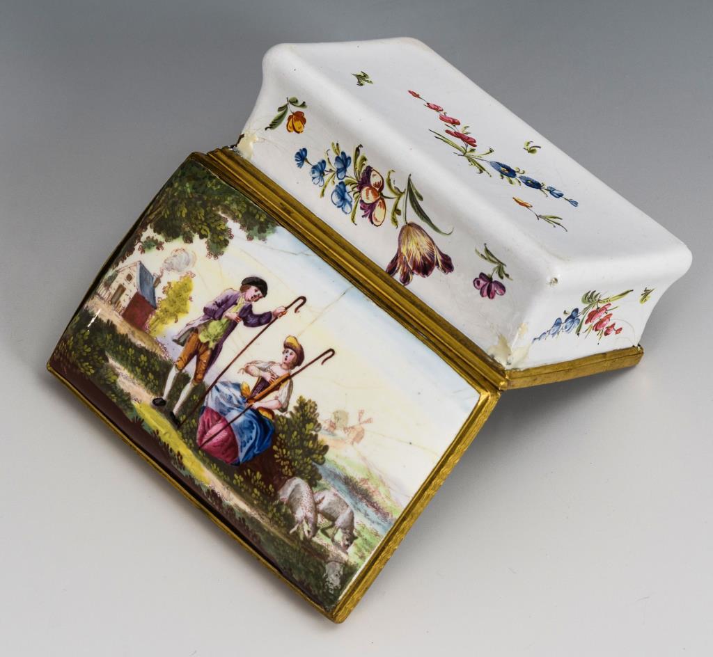 Quaderdose mit eingezogener Wandung allseits und auf dem Boden mit Streublumen bemalt; auf dem Deckel ein Schäferpaar. Haarrissig mit kleineren Fehlstellen und Retuschen.