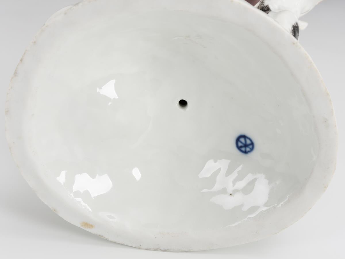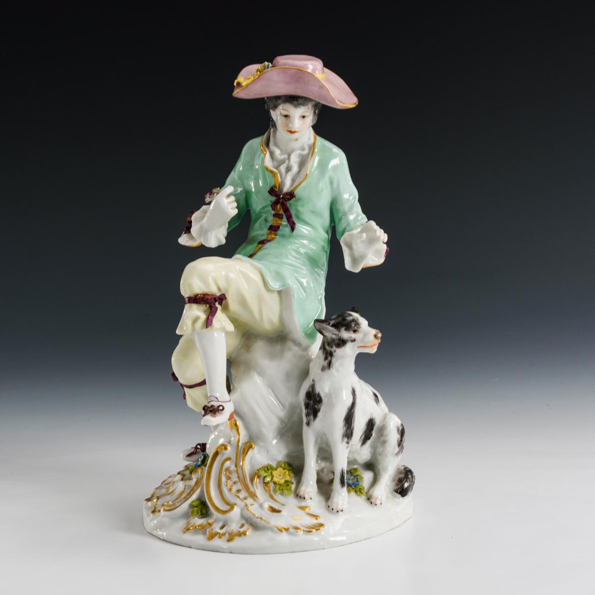 Auf einem Stein sitzender junger Mann mit Jagdhund. Schleifen und Blüten teils bestoßen..