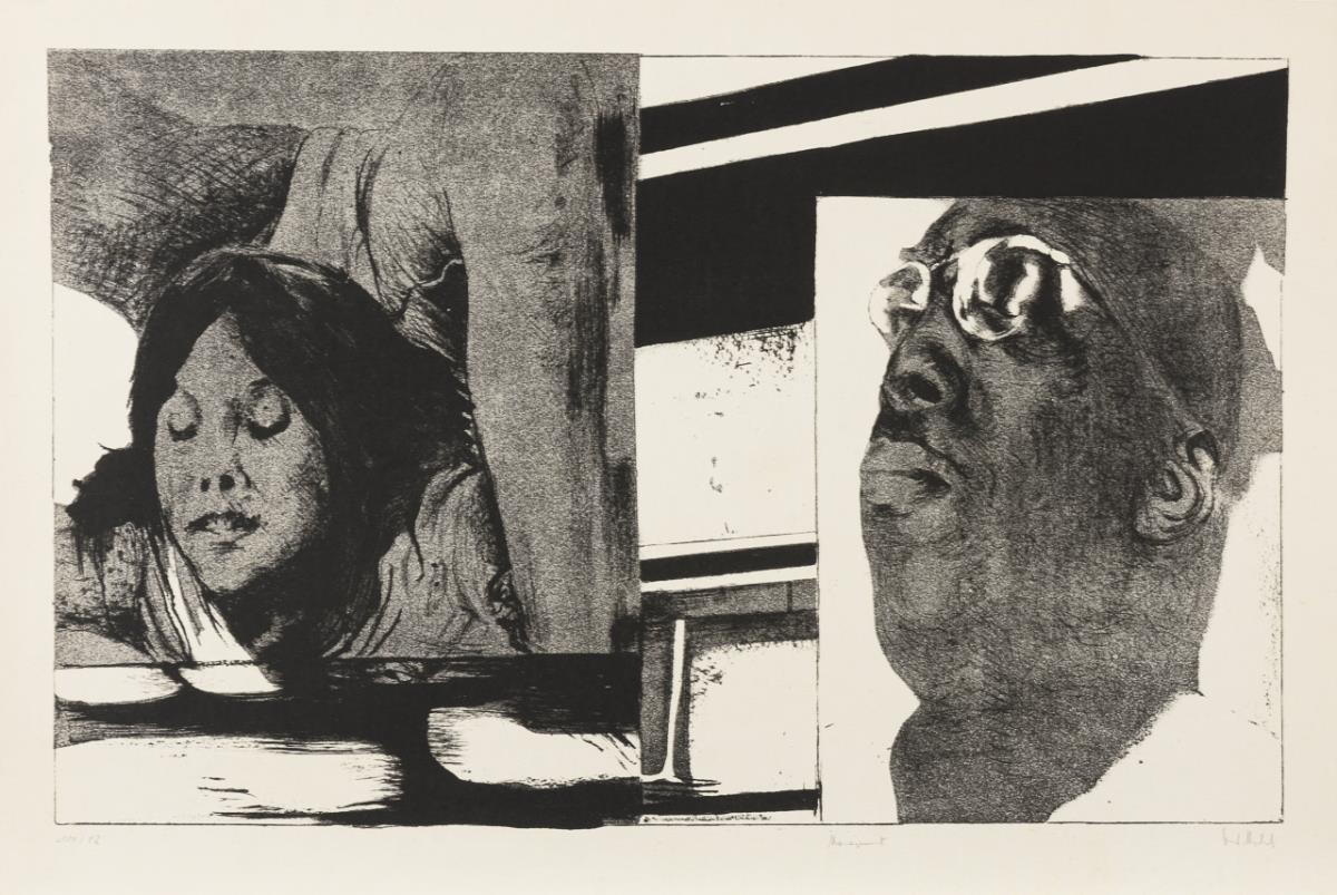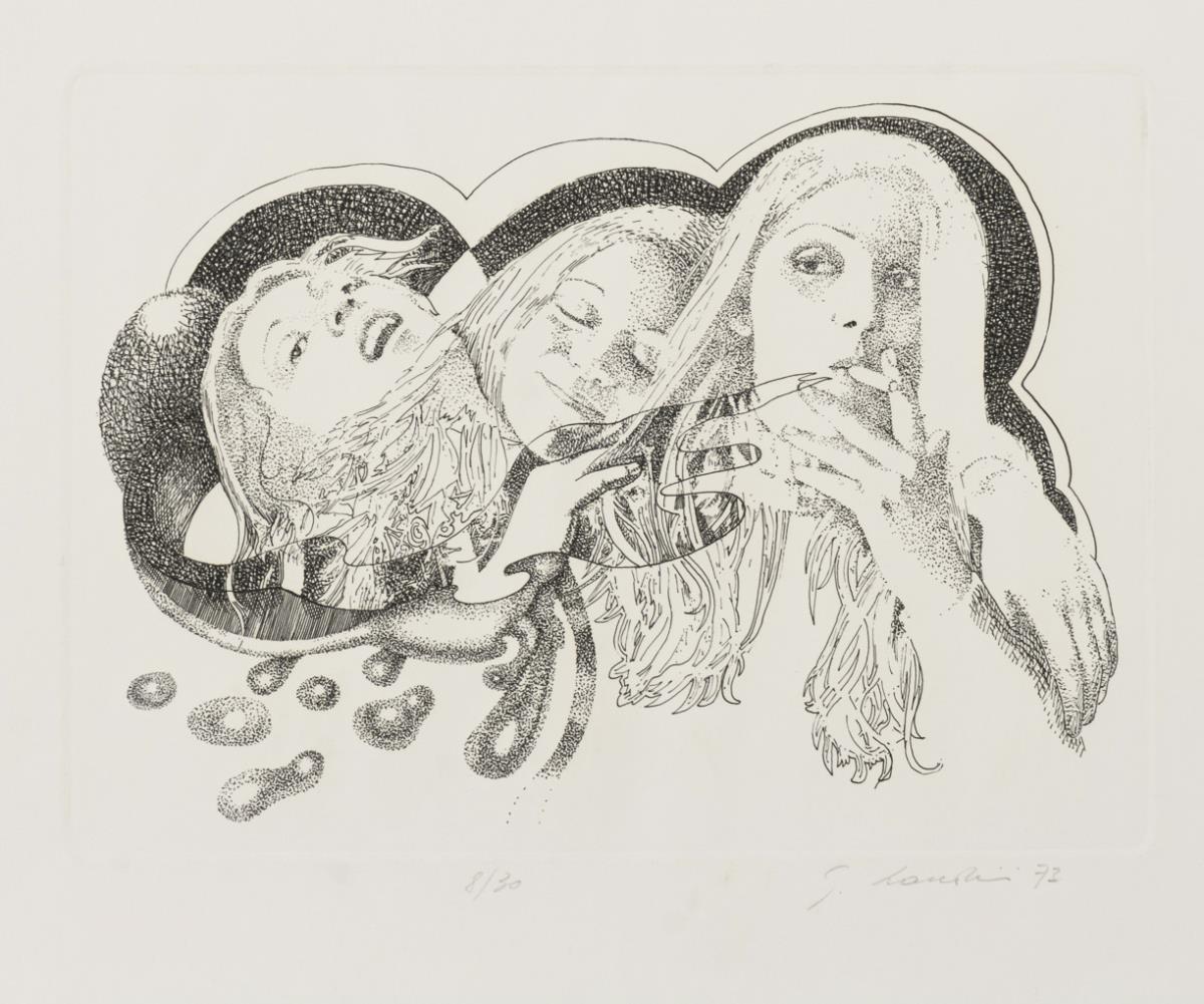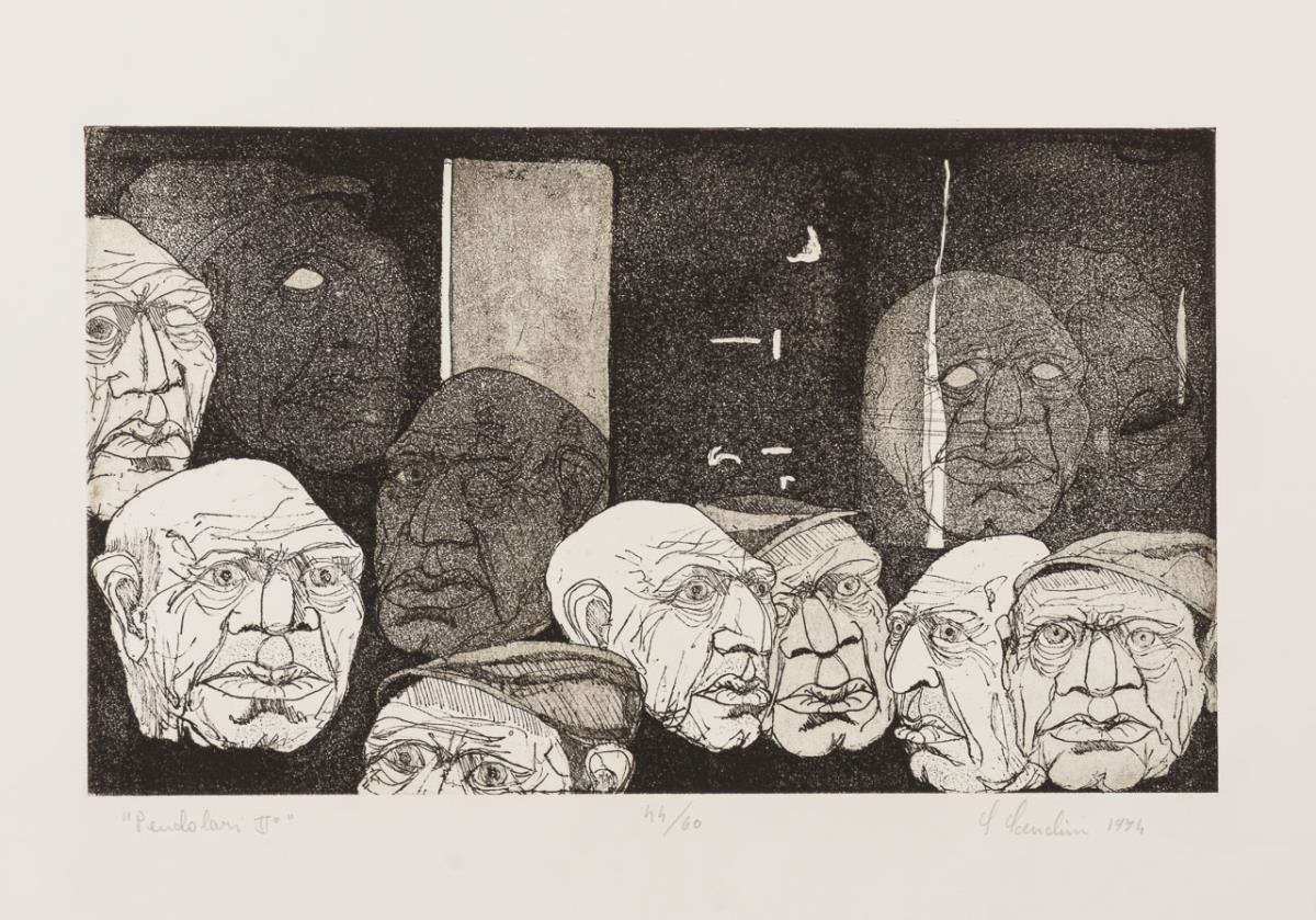 Sandini, S.: "Pendolari II", Radierung, Bleistiftsignatur, verso Etikett "Club Dell'Incisione Venezia Viva", Platte: 28,5 x 48,5 cm, Blatt: 50 x 69,5 cm, Exemplar: 44/60, 1974 | Undeutlich signiert (italienischer Künstler): Köpfe von Damen, Lithografie?, Bleistiftsignatur, verso Stempel "Centro Internazionale Della Grafica - 12", Platte: 26 x 35,5 cm, Blatt: 49,5 x 70 cm, Exemplar: 8/30, [19]73, mit Knicken | Gorini, Gianfranco: Kopf eines Herren, Radierung, Bleistiftsignatur, verso Stempel "Centro Internazionale Della Grafica - 129", Platte: 32 x 25 cm, Blatt: 50 x 35 cm, Exemplar: 28/30, Blatt mit kleiner Bestoßung oben rechts und Knick unten links | Michel, Gerd: "Management", Lithografie. Exemplar: 100/82, 53 x 79 cm.