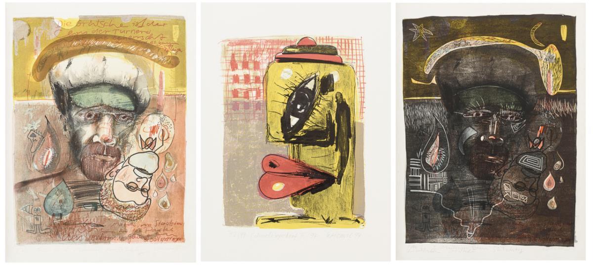 "Schwellkörperkopf IX/94", Blatt: 53,5 x 39 cm, Exemplar: 72/99, [19]94 | "Für Erich Mühsam zum 50. Todestag", Platte: 47 x 35 cm, Blatt: 53,5 x 39 cm, Exemplar: B 4/6, datiert: XI/84 | "E. Mühsam zum 50. Todestag", Platte: 48,5 x 34,5 cm, Blatt: 53,5 x 39,5 cm, Exemplar: 1 von 2 Unikatdrucken, datiert: I/85.