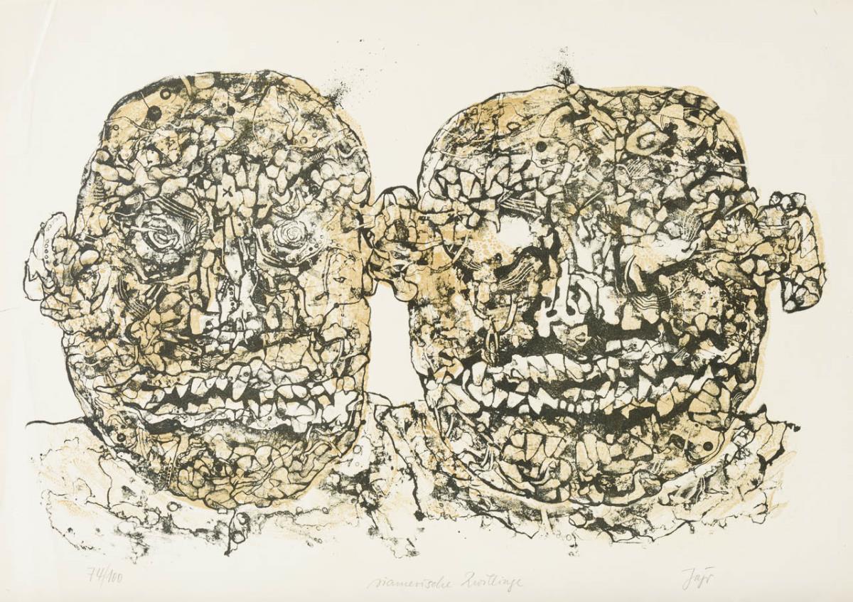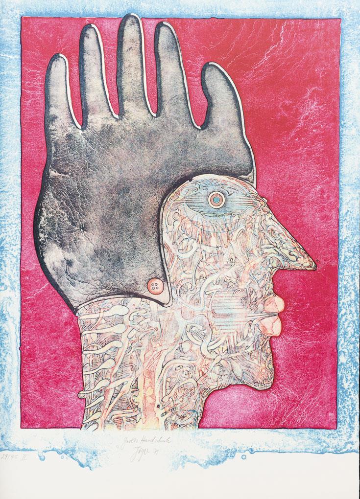 "Siamesische Zwillinge", Blatt: 42 x 59 cm, Exemplar: 74/100, am Rand mit Knicken und kleinen Rissen | "Gnolis Handschuh", Blatt: 59 x 42,5 cm, Exemplar: 29/45 II, [19]71 | Ohne Titel, Blatt: 48,5 x 64 cm, Exemplar: 100/100, [19]74 | "ich und ich und ich", Blatt: 65 x 48,5 cm, Exemplar: 121/125.