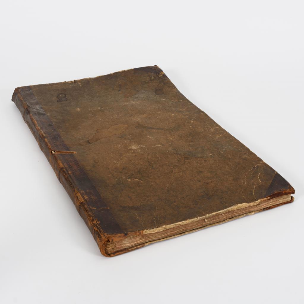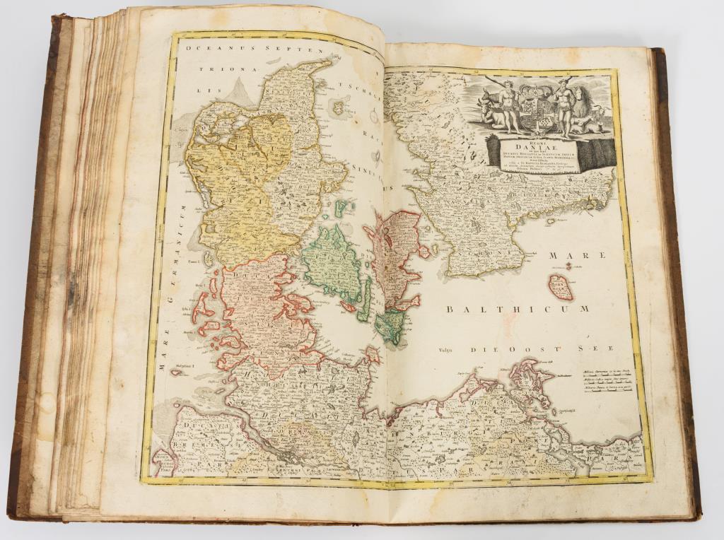 Altkolorierte Kupferstichkarten auf Doppelseiten: Weltkarte 1746, Europa, Asien 1744, Africa, America, "Hispaniae & Portugalliae", Frankreich, Großbritannien, "Belgium catholicum seu decem Provinciae", "Belgium Doederatum" 1748, Schweiz, Italien, "Imperii Romano Germanici", Dänemark, Skandinavien 1776, "Regni Poloniae", "Borussiae", Ungarn, "Imperii Russici", "Imperium Turcicum", Mittelmeer, "Danubii", "Imperii Persici", "Der südliche Theil des Ober-Sächsischen Kreises", "Circuli Saxonici Inferioris", "Belgii Universi", "Charte über die XIII vereinigten Staaten von Nord-America" 1784 . Karten großflächig wasserfleckig, was durch die alte Kolorierung auf der Vorderseite wenig auffällt. Halbledereinband mit starken Gebrauchsspuren. Buch mit Alters- und Nutzungsspuren, aber gut erhalten und mit antikem Charme.