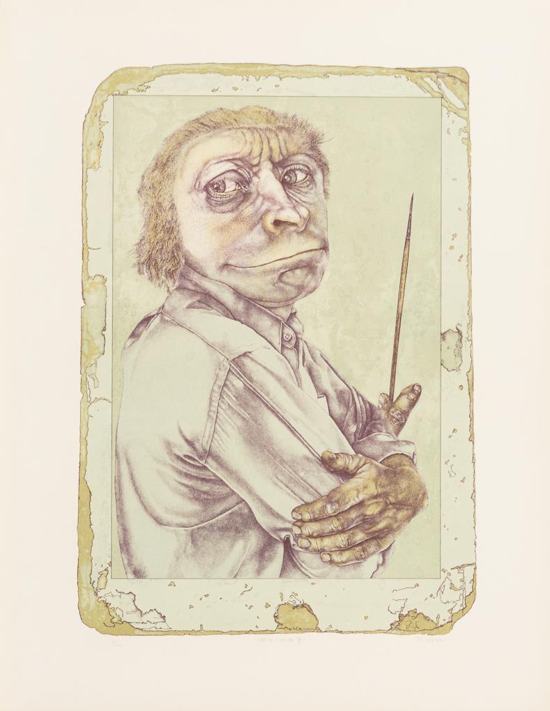 "Selbst als malender Affe", Blatt: 66 x 50,5 cm, Exemplar: 26/100, [19]76 | "Selbst, äffisch", Blatt: 65 x 50,5 cm, Exemplar: 44/80, [19]76 | "Der Schatten der Sonnenuhr", Blatt: 66 x 50,5 cm, Exemplar: 21/100, [19]72 | "Selbstbildnis (hündisch)", Blatt: 59 x 42,5 cm, Exemplar: 72/100, [19]69 | "Bildnis Fräul. Chr. Kannin Bläulich", Blatt: 47 x 41,5 cm, im Passepartout: 50,5 x 65 cm, Probedruck, [19]62.