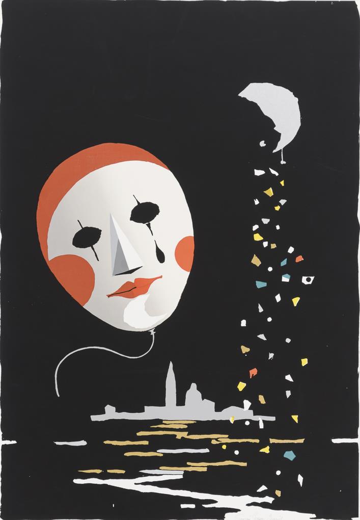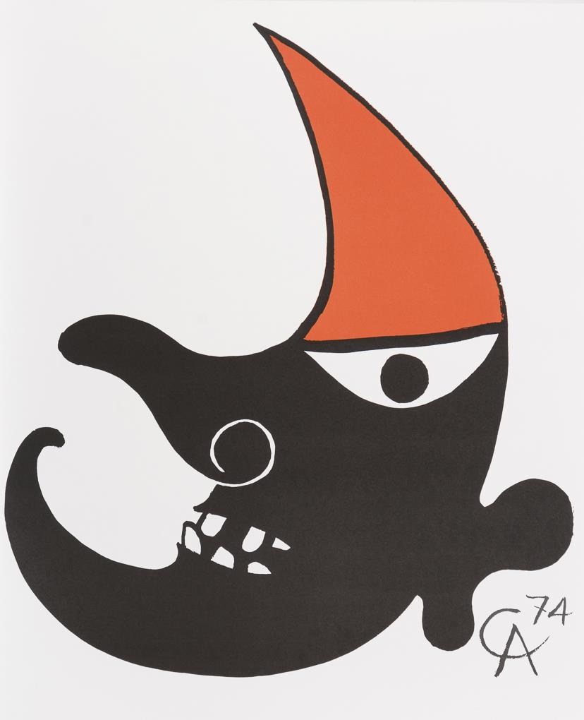 Calder, Alexander (1898 Lawnton - 1976 New York City): Mondgesicht, Farbsiebdruck, im Druck monogrammiert, Blatt: 68 x 56,5 cm, [19]74, Ecken links etwas geknickt | Undeutlich signiert (italienischer Künstler?): Kopf des Pierrot, Farbsiebdruck, Bleistiftsignatur, Blatt: 69,5 x 48 cm, Exemplar: 48/80, mit leichten Kratzspuren und minimal bestoßenen Ecken.