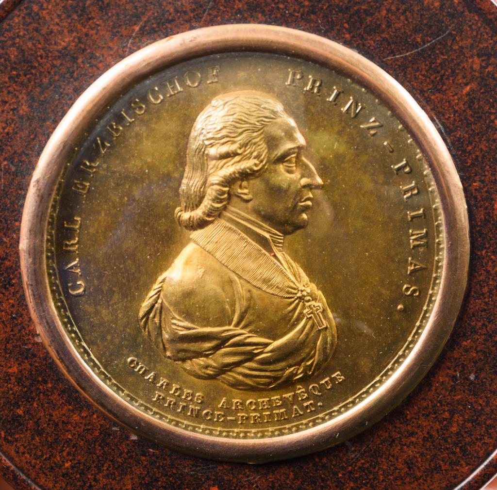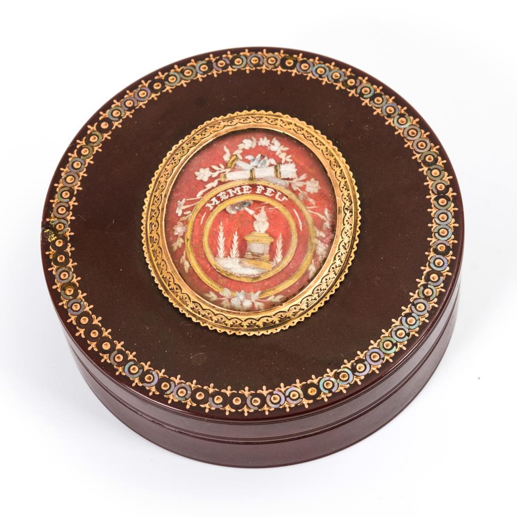 Wohl braunen Jaspis imitierende Dose mit Liebes-Altar "Même Feu" im Goldrahmen. / Roten Jaspis imitierende Dose mit dem Bildnis des Karl Theodor von Dalberg (1744-1817). Kleinere Ausbrüche/Fehlstellen, 1x minimal haarrissig.
