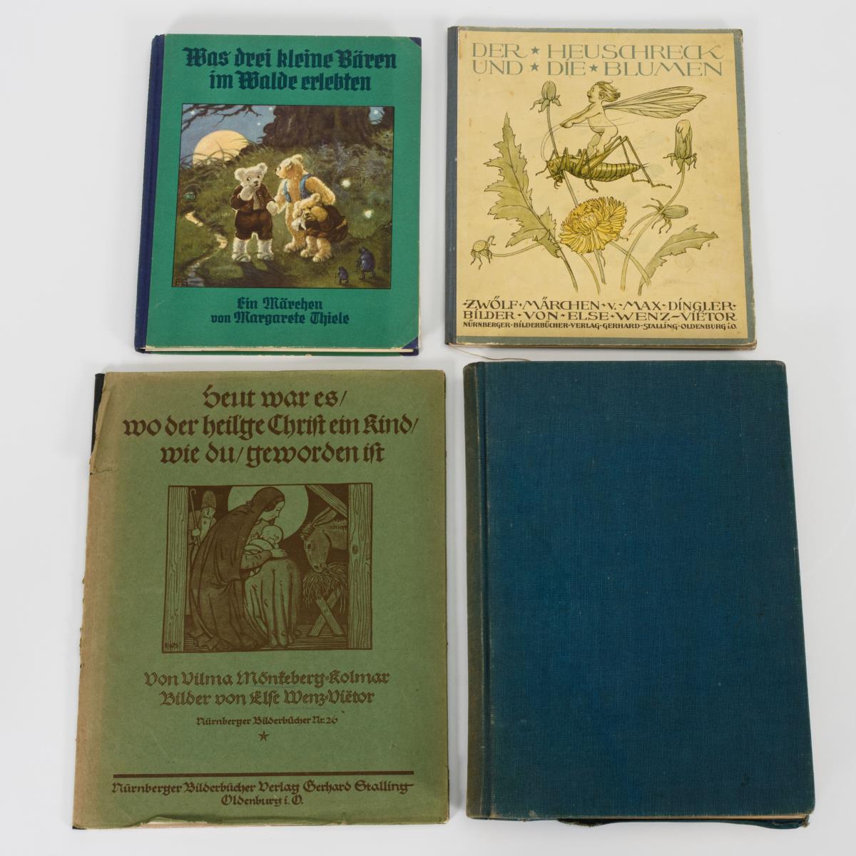 Thiele, Margarethe: "Was drei kleine Bären im Walde erlebten", Dresden 1923, Verlag H.F. Abshagen, 51.-56. Tausend, 77 Seiten mit Abbildungen. Halbleineneinband mit leichten Gebrauchsspuren, 23 x 19 cm. / "Das Kränzchen - Illustrierte Mädchen-Zeitung", 39. Jahrgang, (1927) 434 Seiten. Leineneinband mit stärkeren Gebrauchsspuren, 29 x 21 cm. / Mönkeberg-Kolmar, Vilma: "Heut war es, wo der heilige Christ ein Kind, wie du, geworden ist". Oldenburg 1924. Verlag Gerhard Stalling. 20 Seiten mit farbigen Illustrationen von Else Wenz-Vietor. Nürnberger Bilderbücher Nr. 20, im Schutzumschlag. 29 x 23 cm. / Dingler, Max: "Der Heuschreck und die Blumen: Zwölf Märchen." Nürnberger Bilderbücher-Verlag Gerhard Stalling, Oldenburg 1924, 2. Auflage. 26 Seiten. Halbleineneinband mit Altersspuren. 24 x 21 cm..