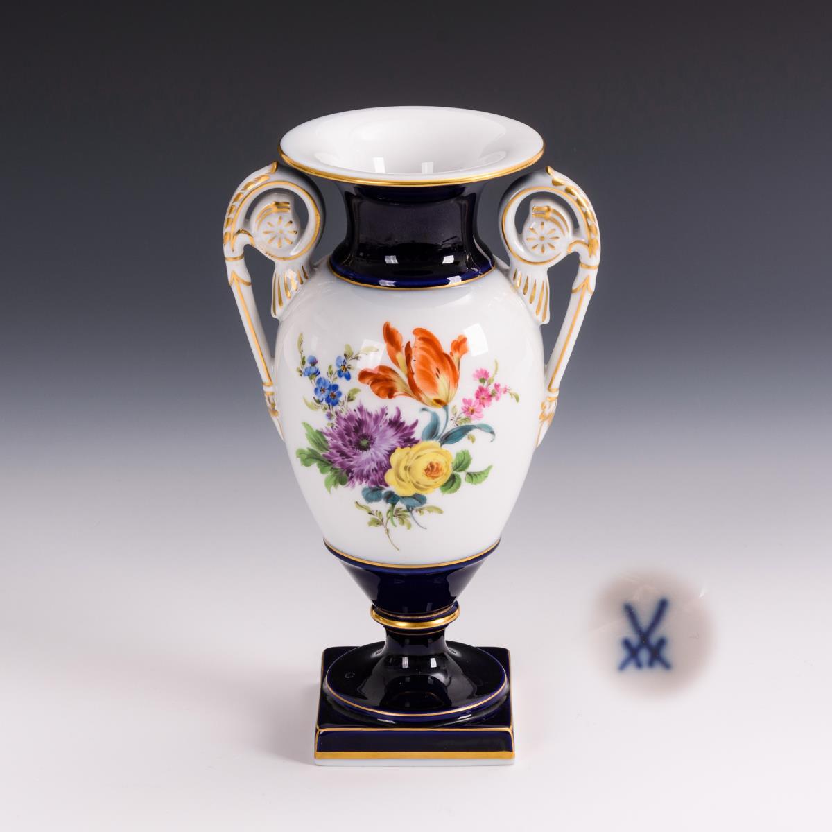 Kobaltblauer Teilfond, polychrome Blumenmalerei, Goldstaffage. H 23 cm.