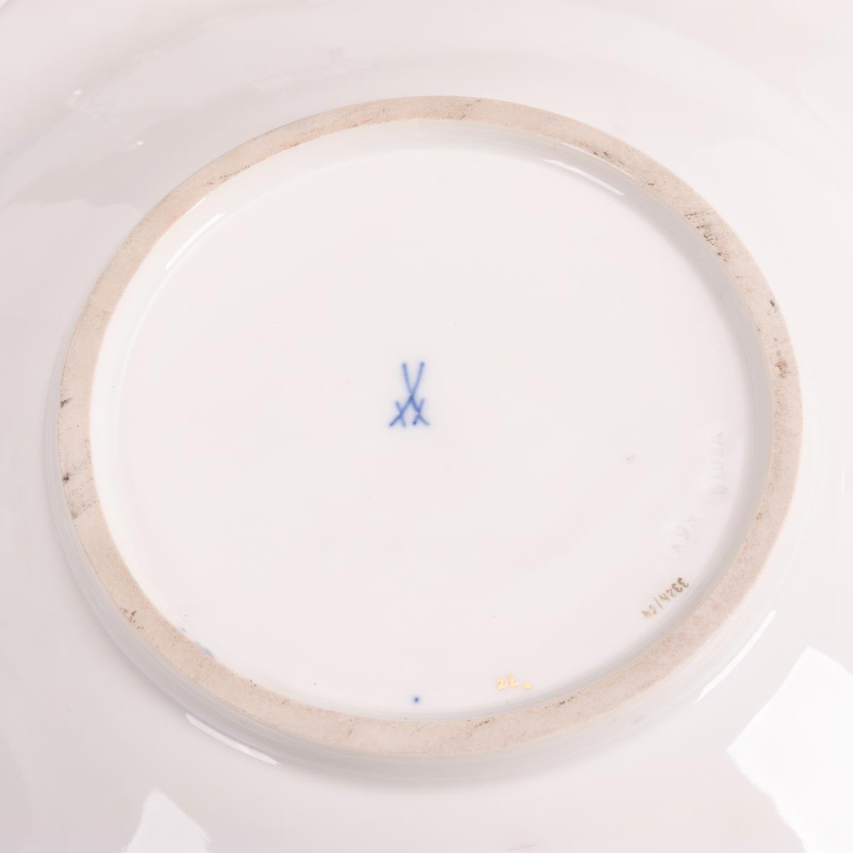 Kobaltblauer Teilfond, polychrome Blumenmalerei, Goldstaffage. Ø 30 cm..