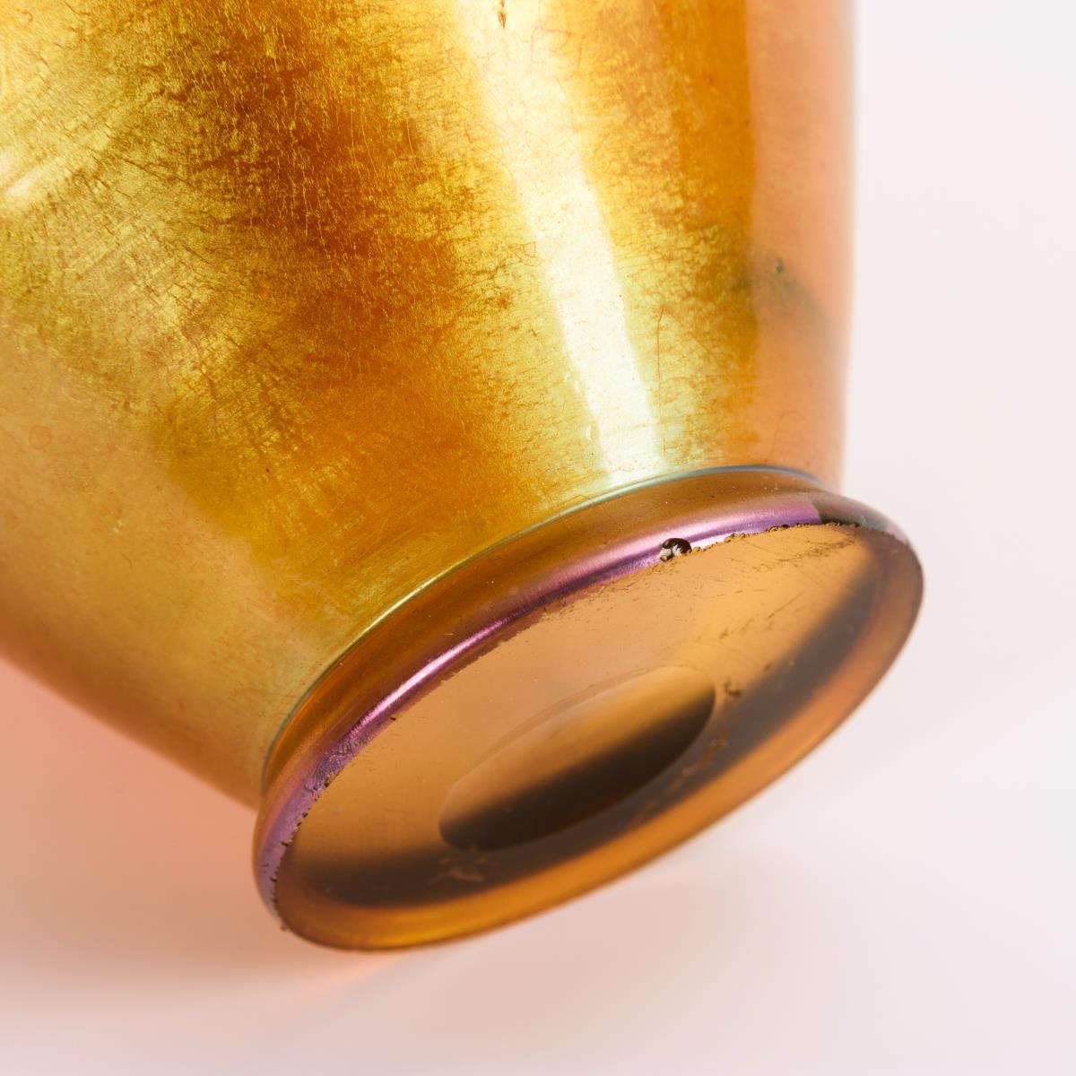 WMF. Um 1930. Bernsteinfarbenes, irirsiertes Glas. H 15,5 cm. Konischer Korpus, kurzer Enghals, Kratermündung, ausgekugelter Abriss..