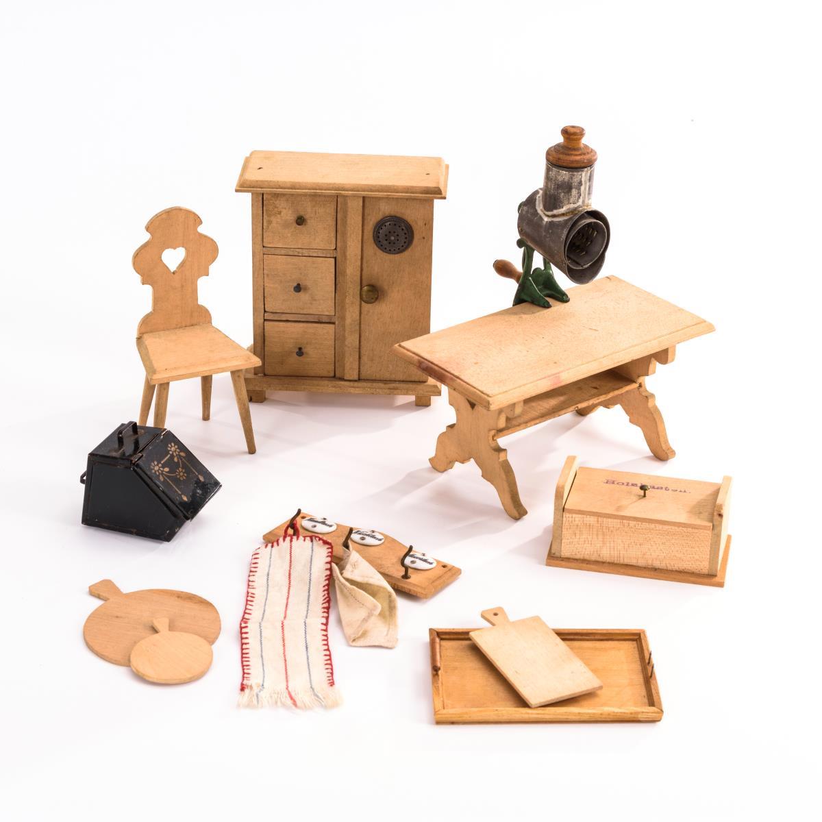 Helle Holzmöbel, dazu aus Blech: Kohlenkasten und Mandelmühle.