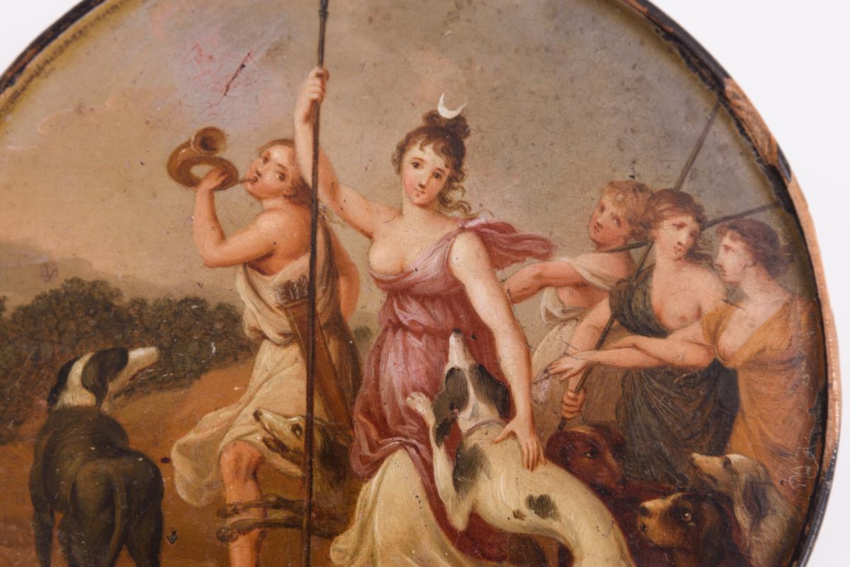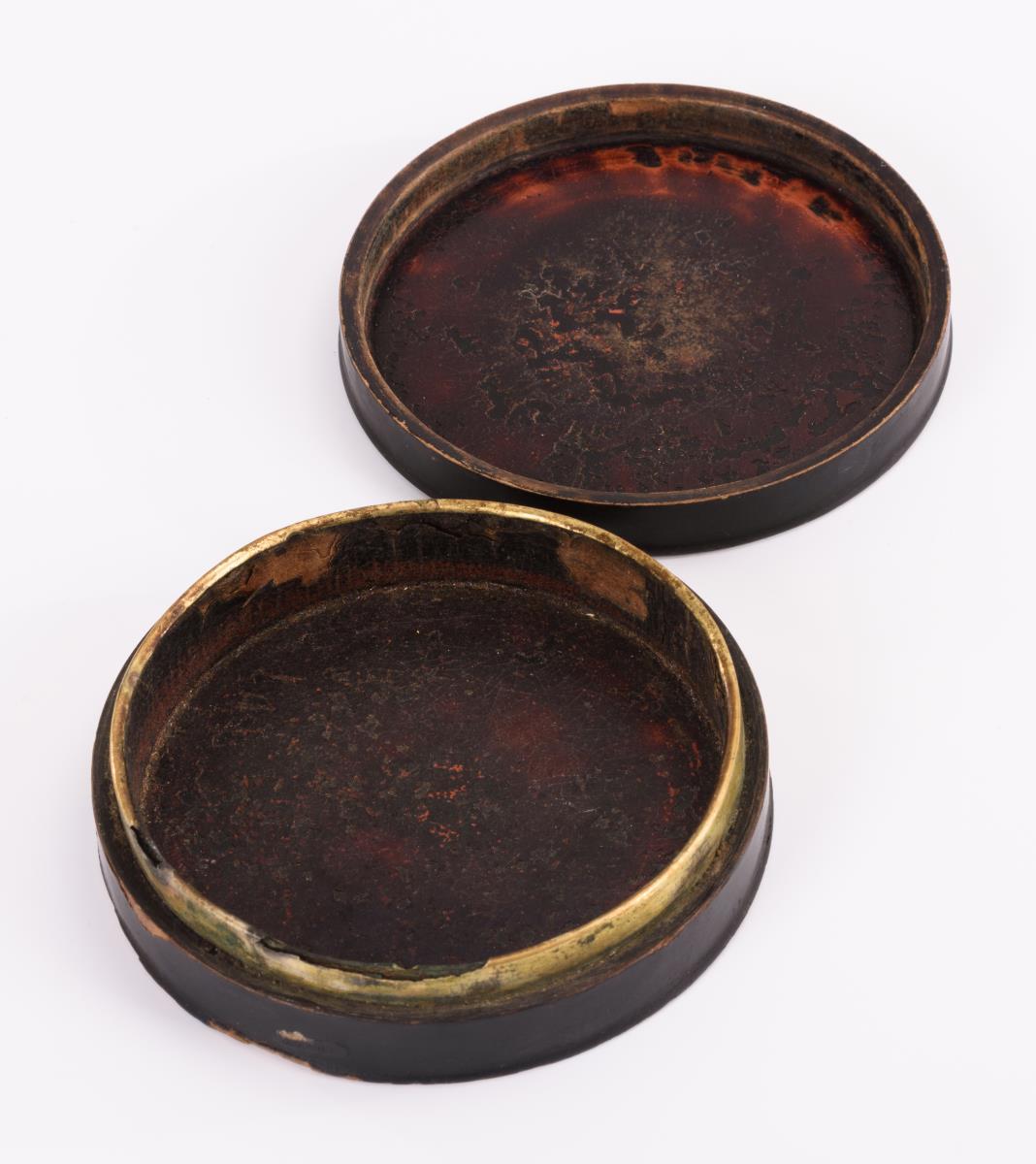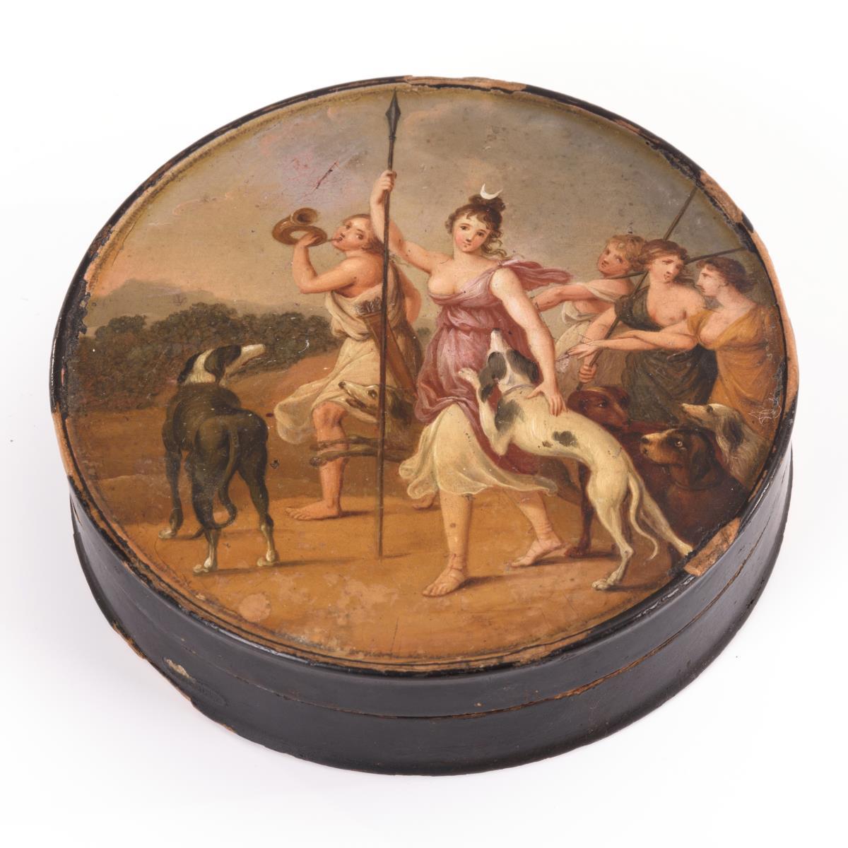 Papiermaché schwarz lackiert, Deckel polychrom bemalt.
