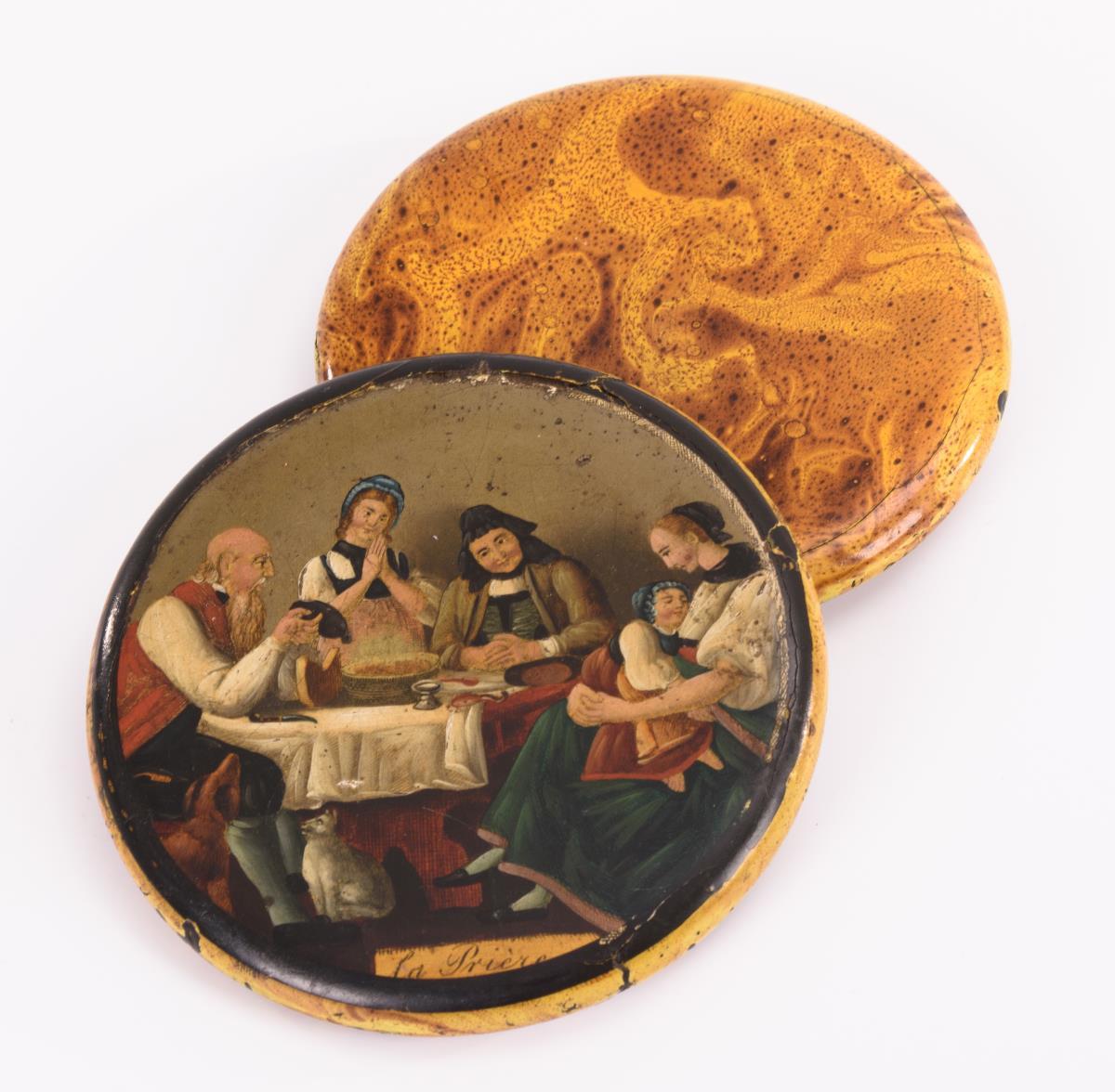 Papiermaché lackiert, Deckel polychrom übermalte Lithografie.