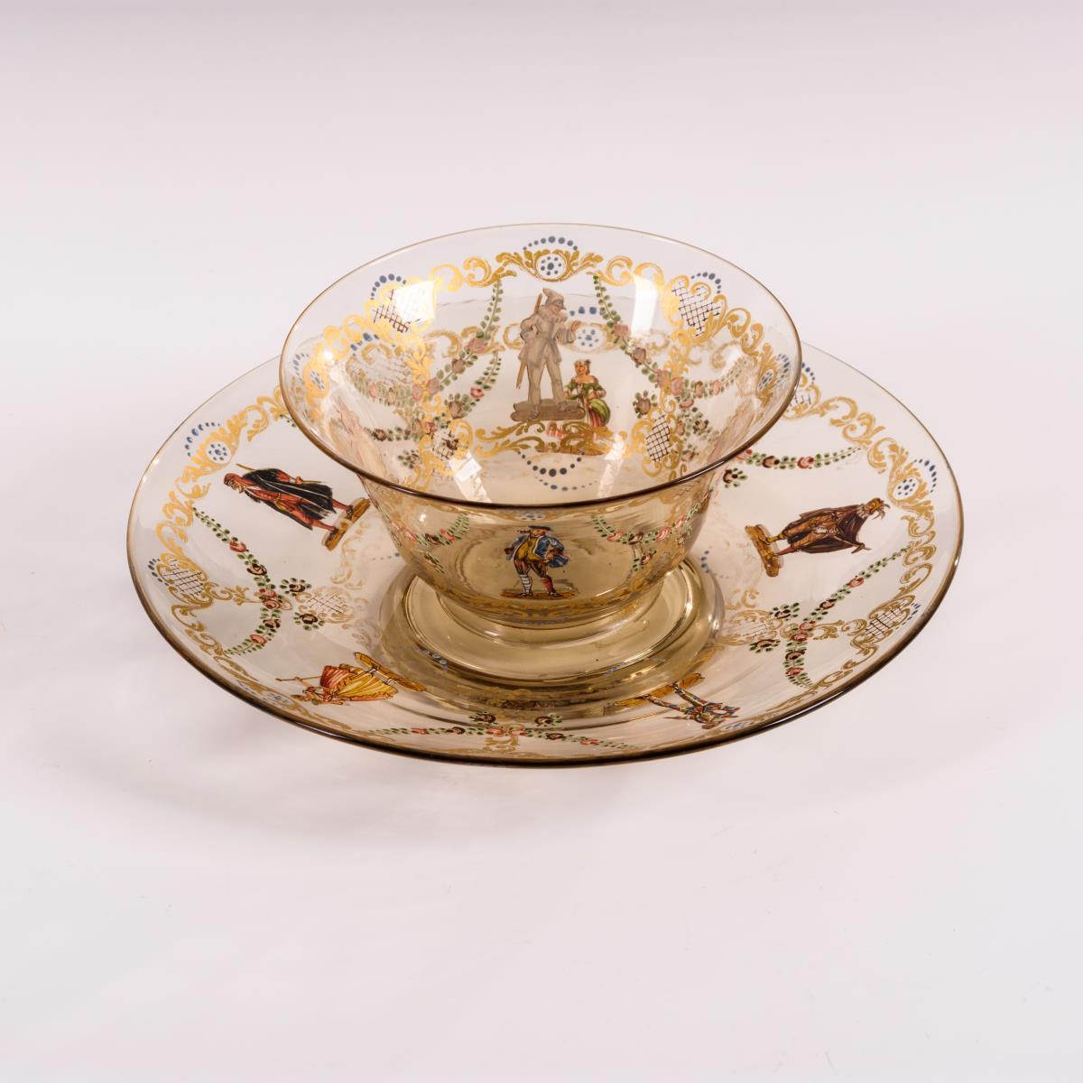 Schale und Untertasse mit Emailmalerei.