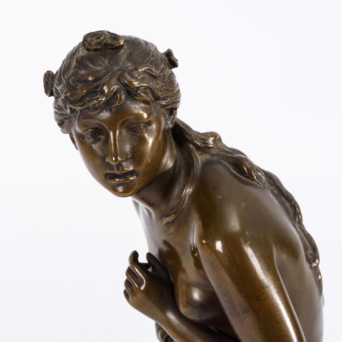 An den antiken Typ einer Venus pudica angelehnte Gestaltung der Frau mit halb herabgelassenem Tuch. Kleinere Abplatzer am Sockel, sonst wenige Alters-/Gebrauchsspuren.