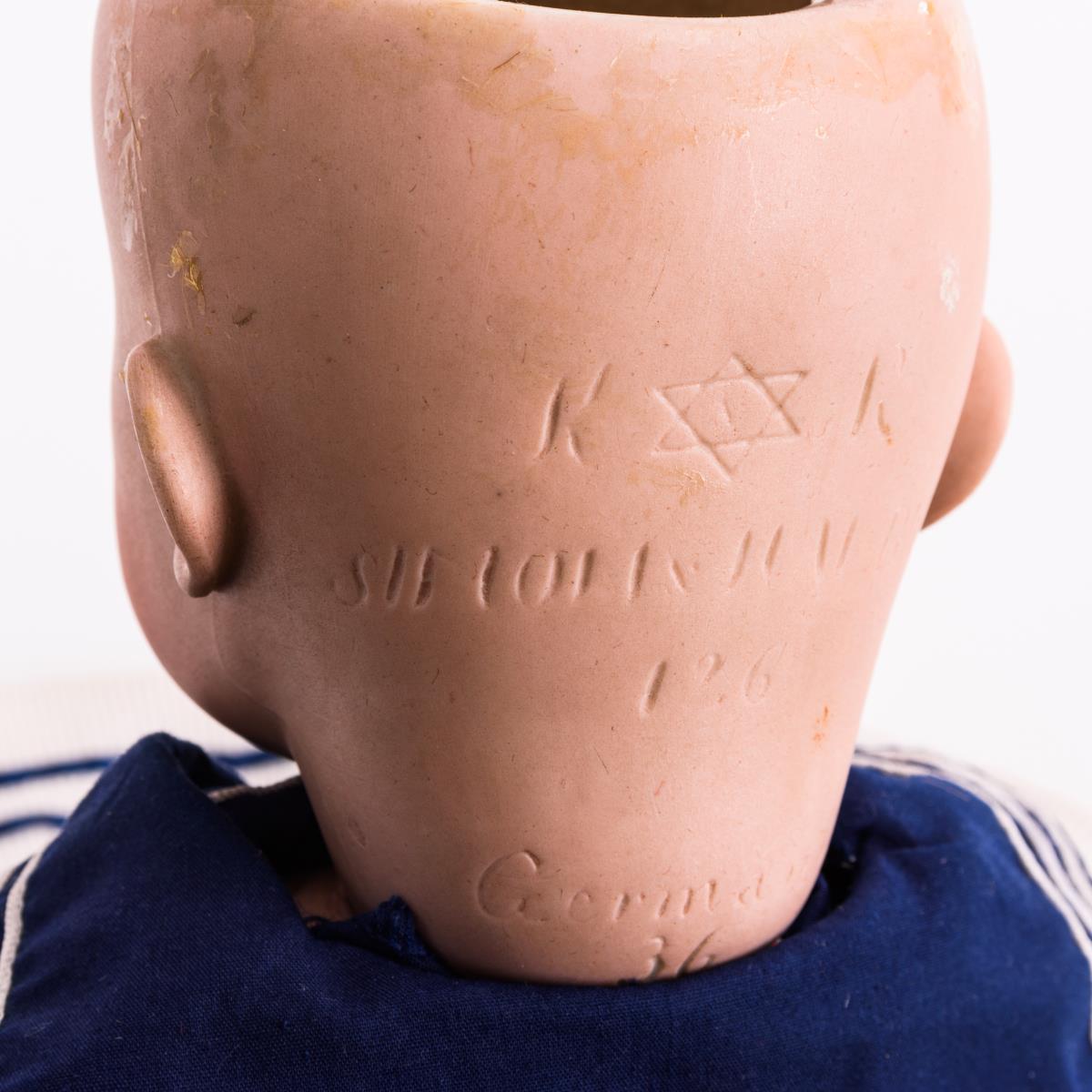 Kopf durchleuchtet: ohne Defekte, lediglich 1 Zahn fehlt. Torso mit Farbdefekten, linker Daumen bestoßen.