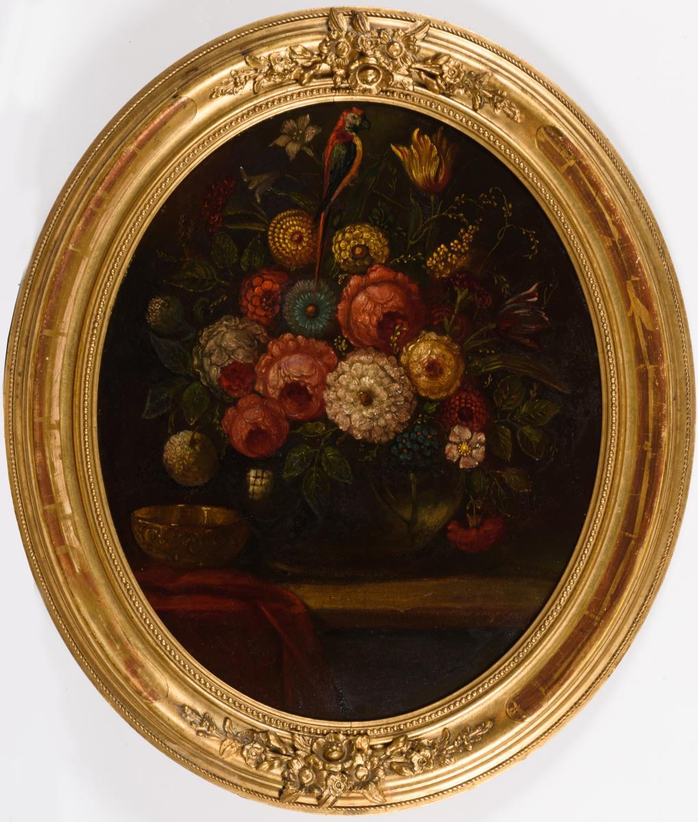 STRIEDL, H. Blumenstillleben mit Papagei Öl/Malkarton. Rechts unten signiert. Anfang 20. Jh. 55 x 45 cm. Gerahmt: 70 x 60 cm. Blumenstück im Stil der Altmeister, mit Papagei auf einem Tisch neben goldener Schale. Altersspuren..