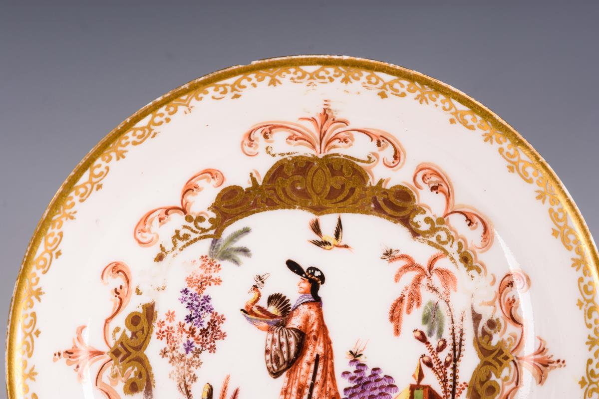 In einer aufwändig ornamental gerahmten Kartusche eine Chinesenszene: einen Vogel in einer Schale tragender Chinese.