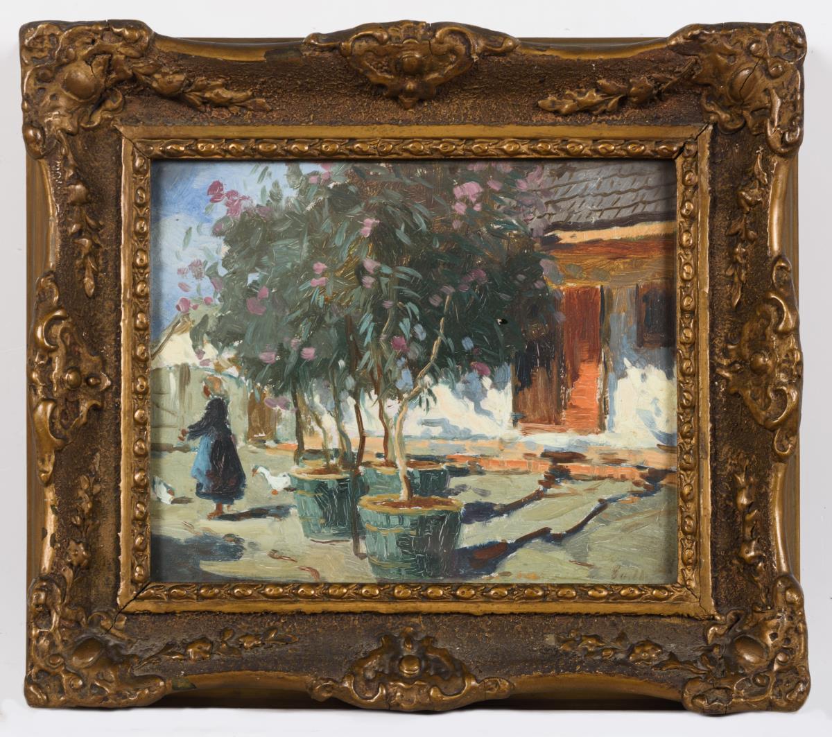 Ungarischer Maler: Sonniger Bauernhof mit Enten und Bauersfrau