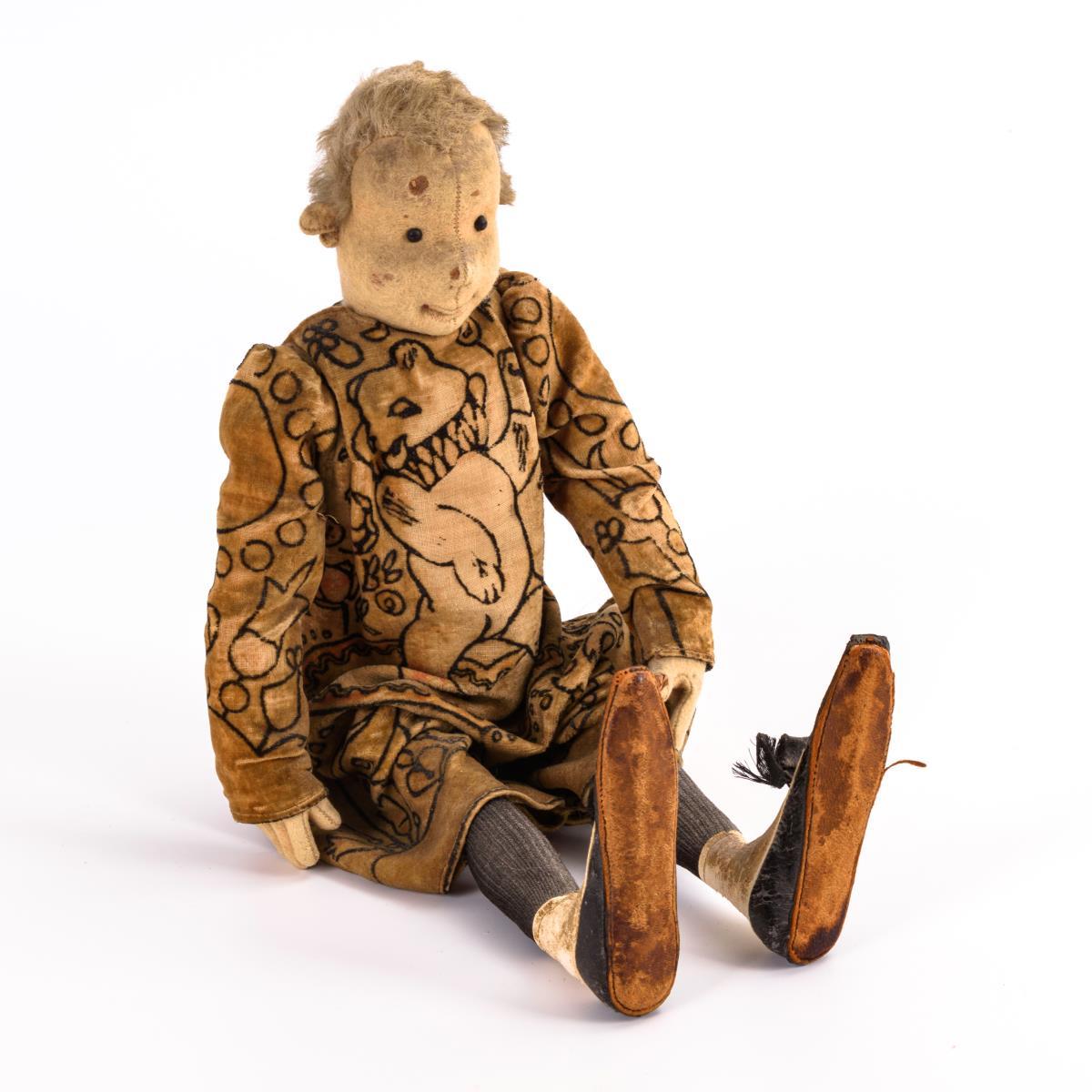 Altersspuren, kleine Defekte, Farbe stark verblichen, Hut fehlt.