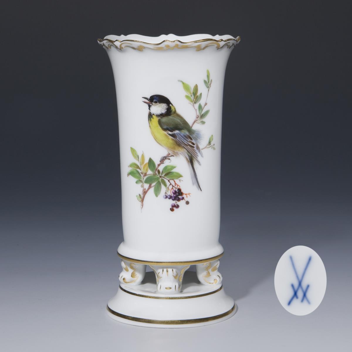 Feine farbige Bemalung. Vogel-und Insektendekor, gold staffiert. Ritzmarke, Pressmarke, Malermarke, Schwertermarke.