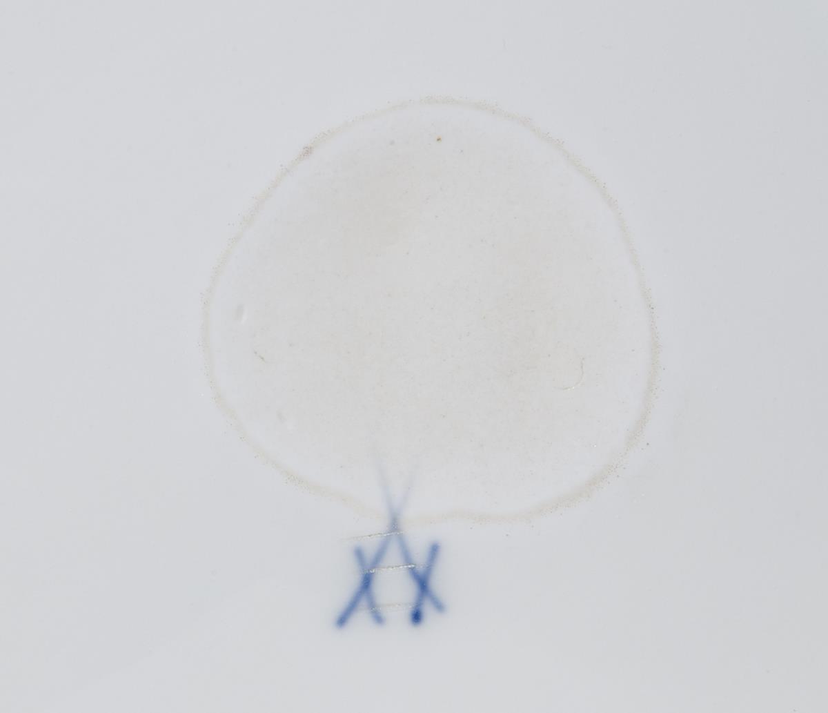 Form-Modell von Rudolf Hentschel 1902-1904. Umlaufend kupfergrüne Camaieumalerei. Rückseitig Blumenbukett, seitlich Einzelblüten. Frontal galantes Paar in Parklandschaft nach Vorlagen von Jean Antoine Watteau, partiell farbig bemalt. Goldspitzenbordüre, gold staffierte Ränder. Ritzmarke, Pressmarke, Schwertermarke dreimal gestrichen.