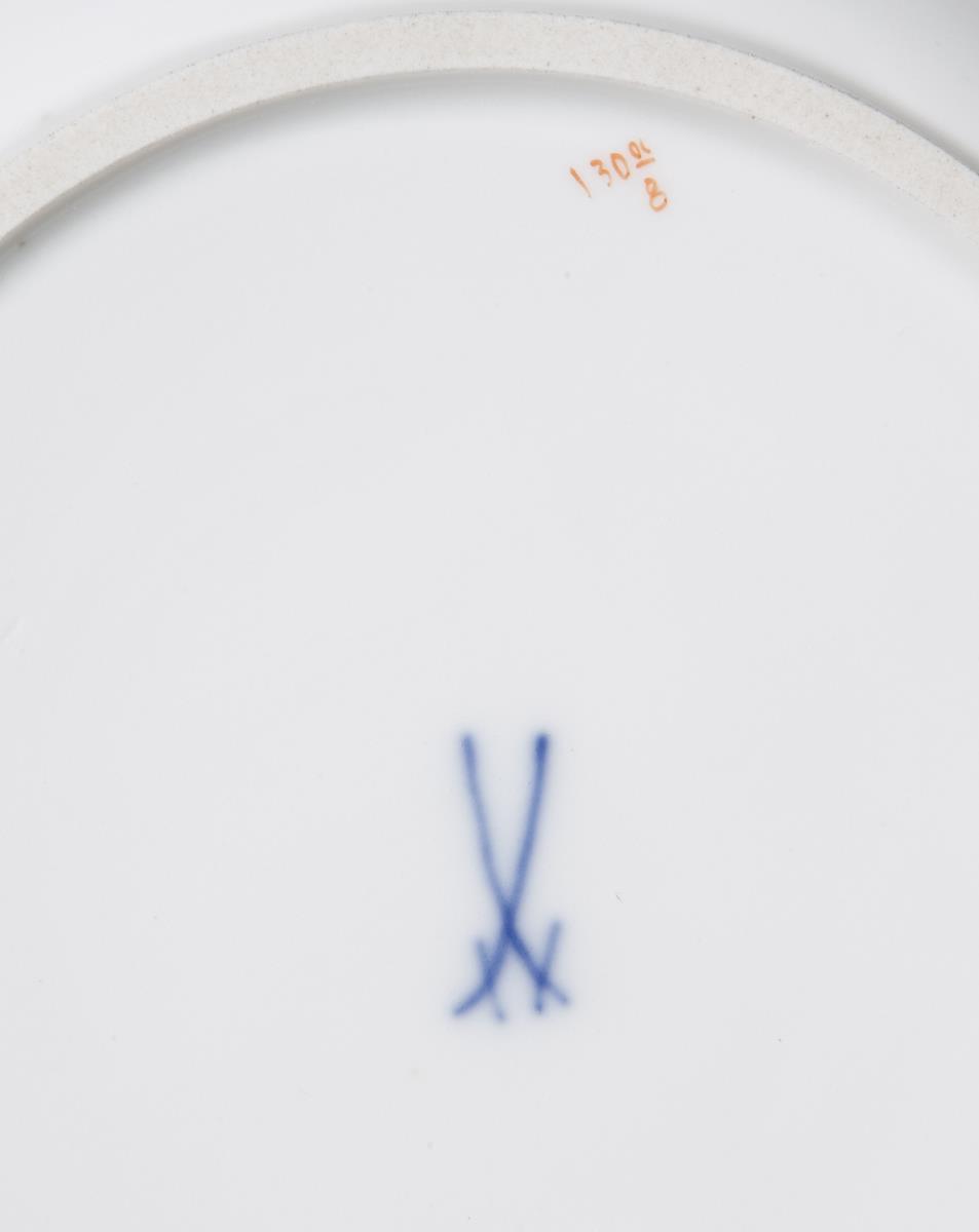 Form "Neuer Ausschnitt". 25 Teile: Gebäckschale, 8 Tassen, 8 Untertassen, 8 Dessertteller. Farbige Blumenbemalung, kobaltblauer Rand mit goldener "A-Kante", Goldstaffage. Pressmarken, Schwertermarken.