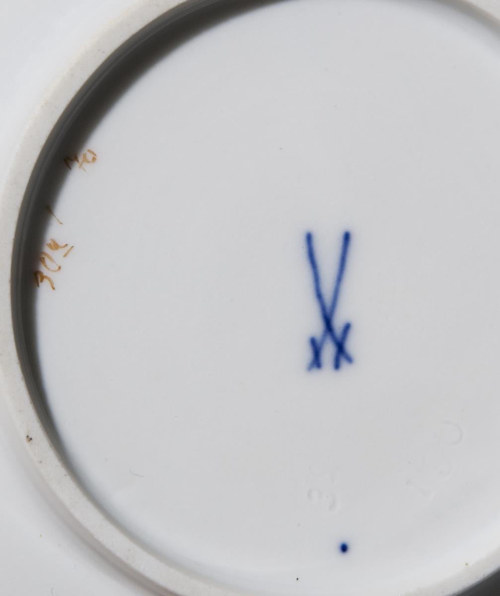 Form "Neuer Ausschnitt". 23 Teile: Kaffeekanne, Milchkännchen, Zuckerdose, Bonbonniére, Gebäckschale, 6 Tassen, 6 Untertassen, 6 Dessertteller. Farbige Blumenbemalung, kobaltblauer Rand mit goldener "A-Kante", Goldstaffage. Pressmarken, Schwertermarken, eine Schwertermarke mit Punkt.
