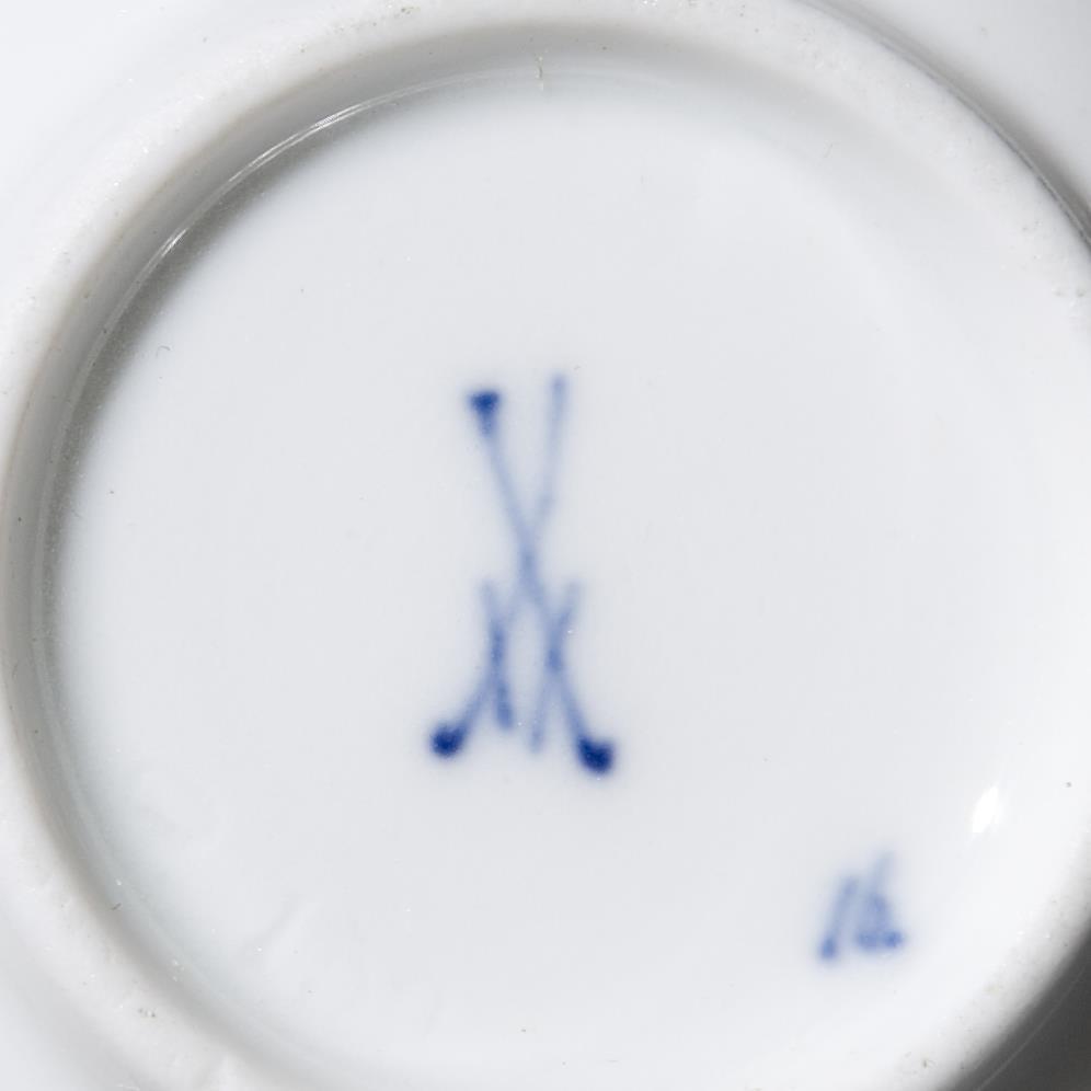 Form "Neuer Ausschnitt". 14 Teile: 4 Tassen, 4 Untertassen, 4 Dessertteller, 1 Zuckerdose, 1 Konfektschale. Kobaltblaue Unterglasurmalerei, "Blumen- und Insektendekor". Pressmarken, Malermarken, Schwertermarken. Vier Schwertermarken mit Punkt, sieben Schwertermarken zweimal gestrichen.
