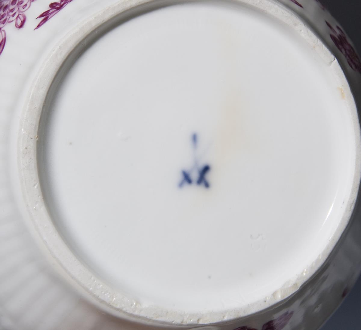 Reliefdekor "Gebrochener Stab". Purpur-Camaieumalerei mit Goldpunkten. Indisch-Garbendekor mit Sonnenkannte. Pressmarke, Schwertermarke.