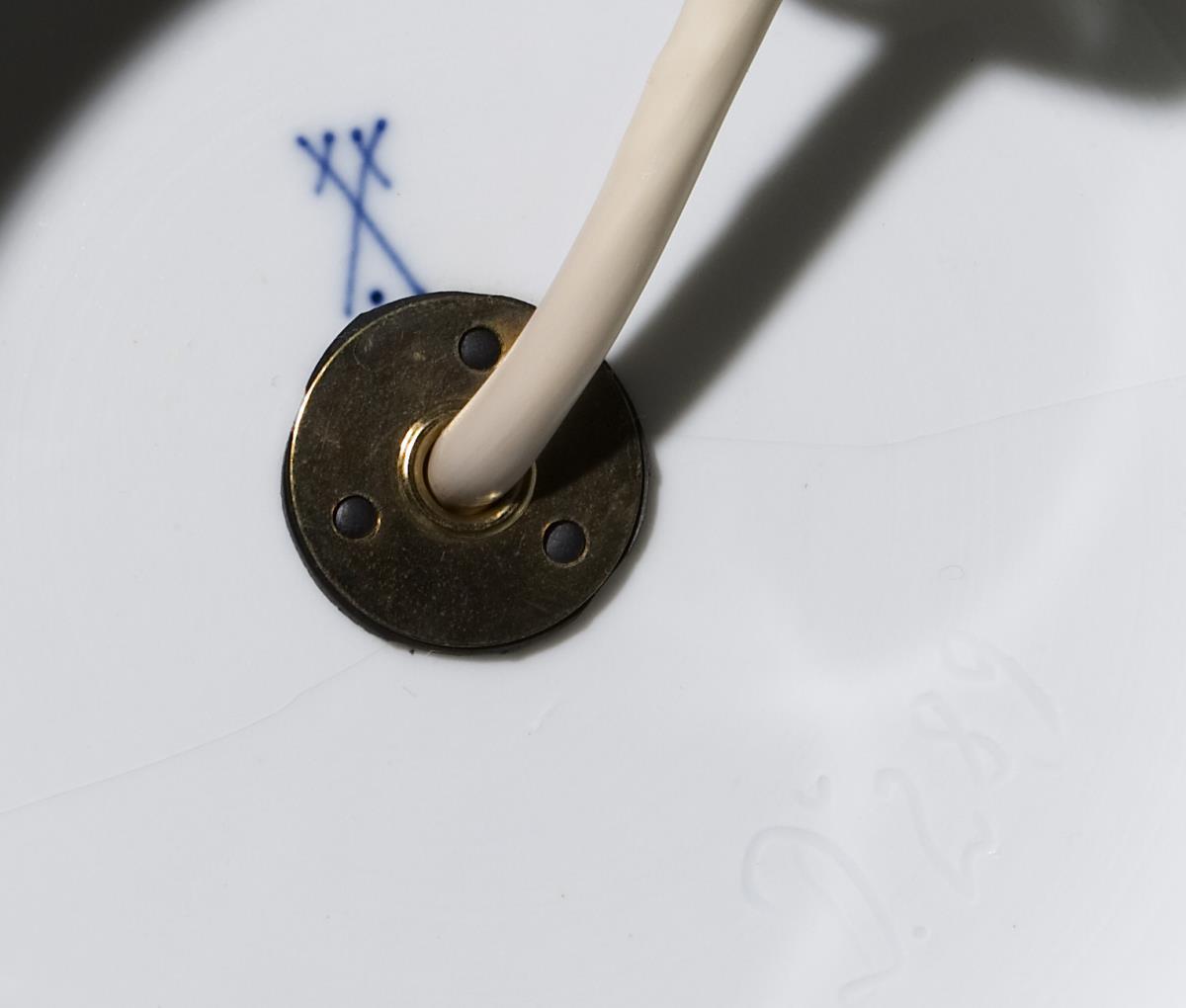 Modell von Paul Börner 1914. Korallenrote Camaieumalerei mit Goldpunkten, Goldstaffage. Alt elekrtifiziert, eine Lichtquelle. Pressmarke, Ritzmarke, Schwertermarke mit Punkt.