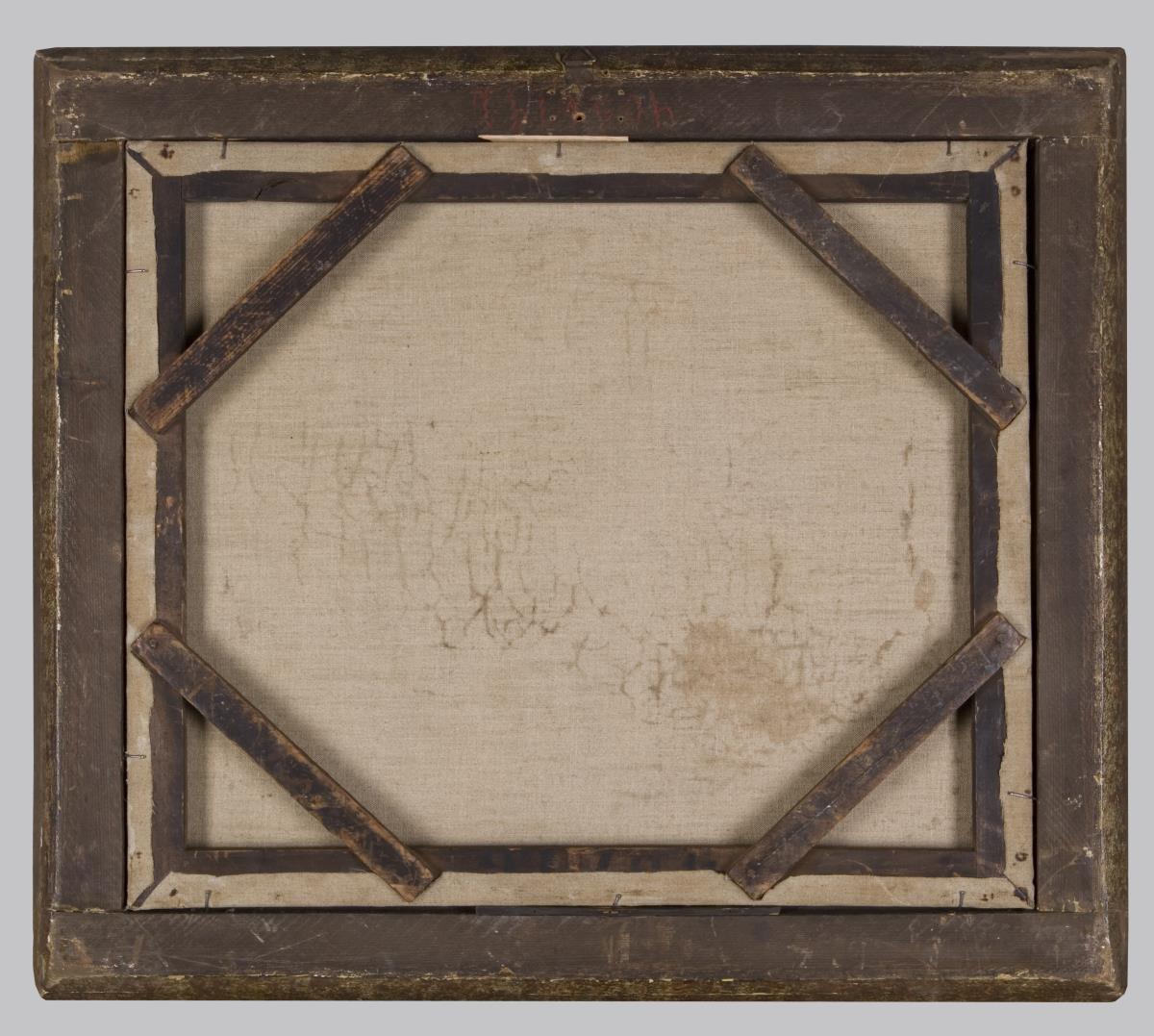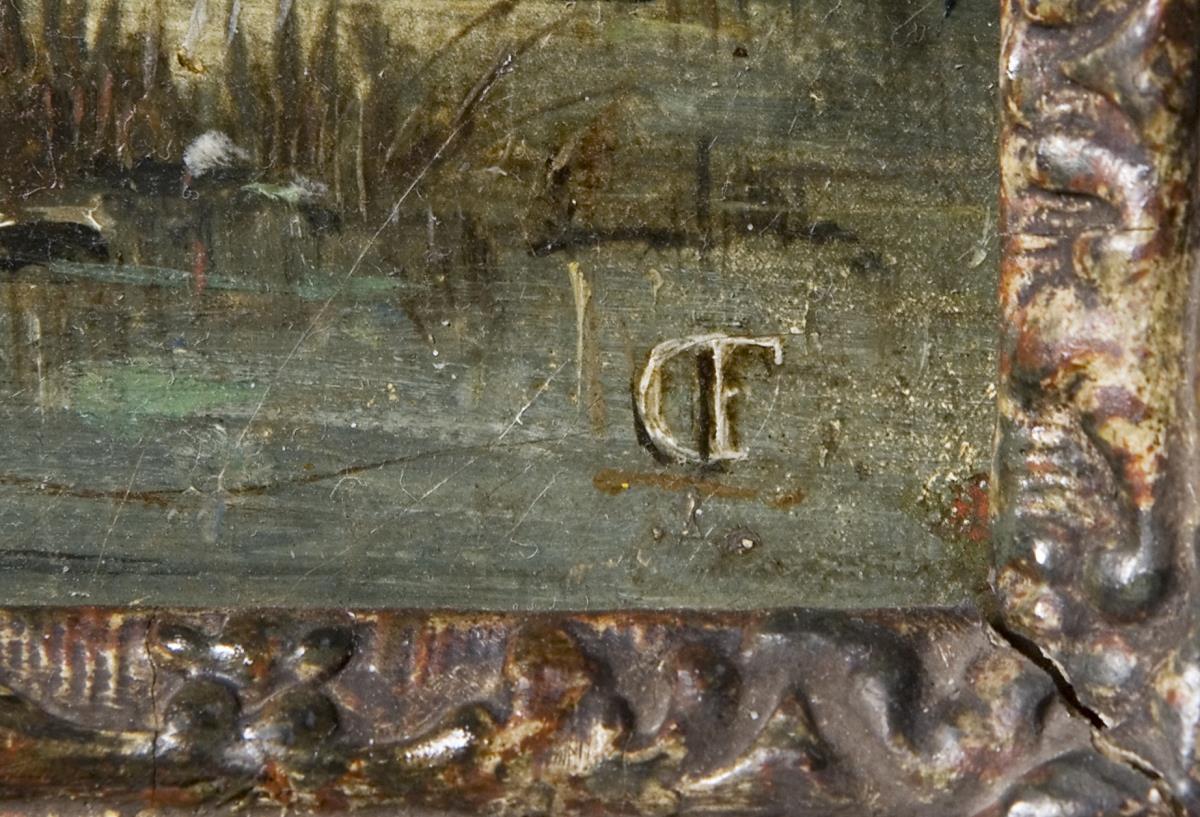 Ligiertes Monogramm CF oder DF. Partiell durchbrochen gearbeiteter Stuckrahmen.