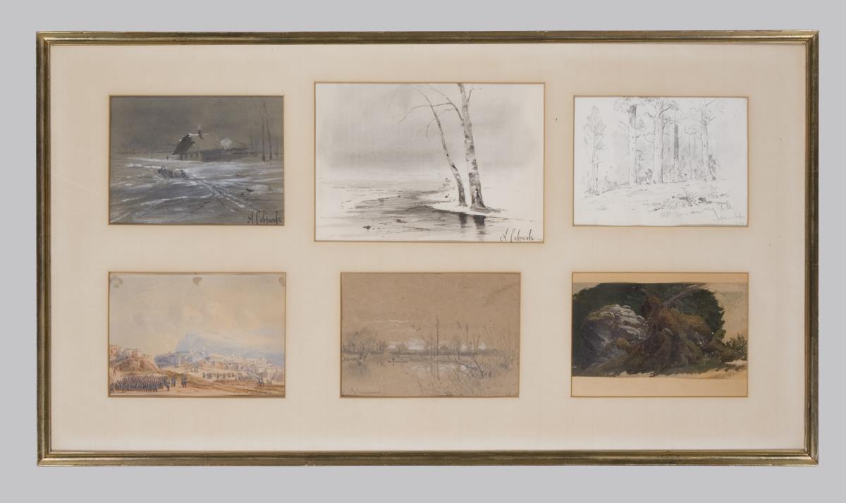 Sechs Blätter in einem Passepartout. 5 Landschaften, 1 Schlachtenszene: Russisch-türkischer Krieg. Vier Blätter signiert. Schlichter verglaster Rahmen.