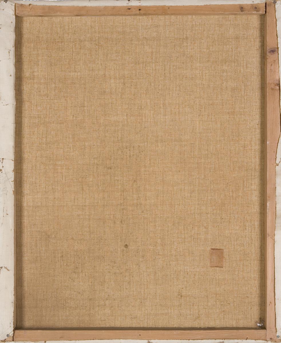 In den Ecken kleinere Farbabplatzer, in einer Ecke Leinwand-Loch, rückseitig unten kleiner Flicken.