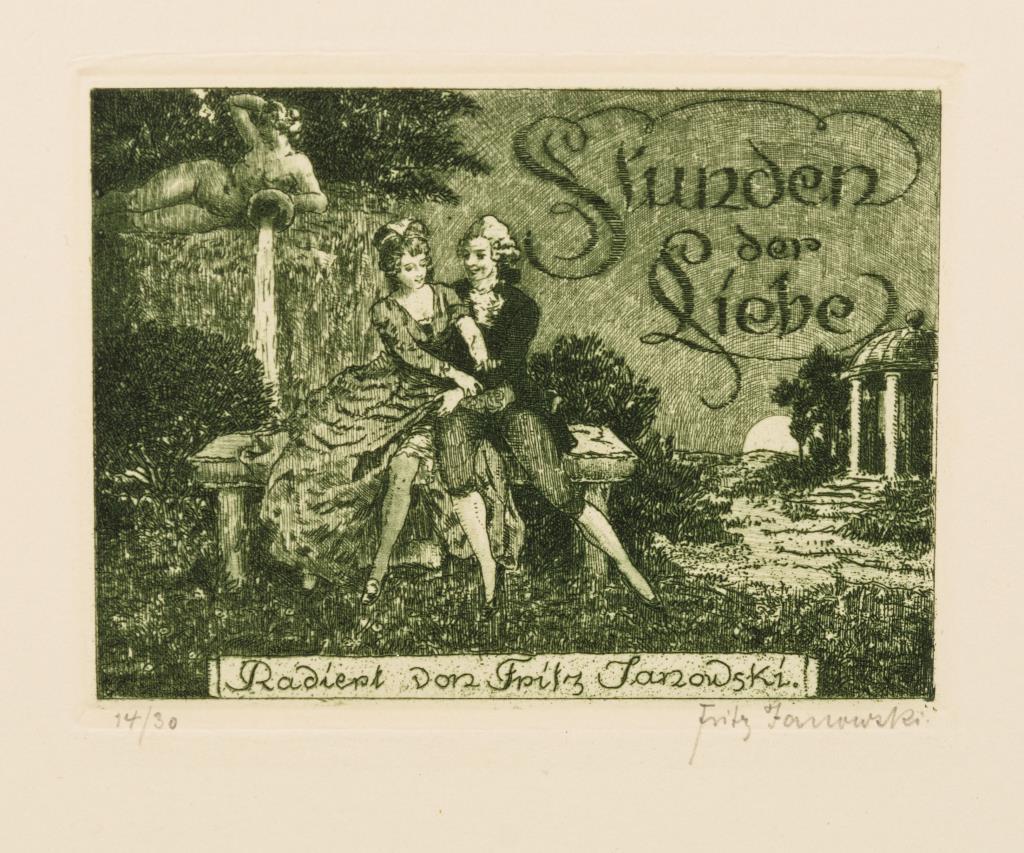 Vorzugsausgabe mit Sammlung von 13 kleinformatigen Radierungen mit erotischen Szenen "Stunden der Liebe. Freie Kupfer aus dem galanten Zeitalter [...] Folge 1", dazu Einlegeblatt "Aus Arkadien", herausgegeben und verlegt von Alfred Hennicke, in orangefarbener Mappe. Passepartouts stockfleckig.