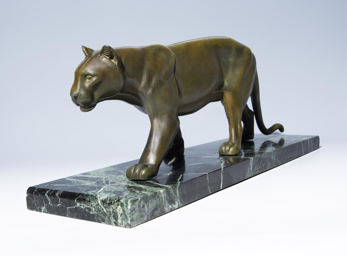 Metall-Guss, grün-braun patiniert. Marmor-Plinthe.