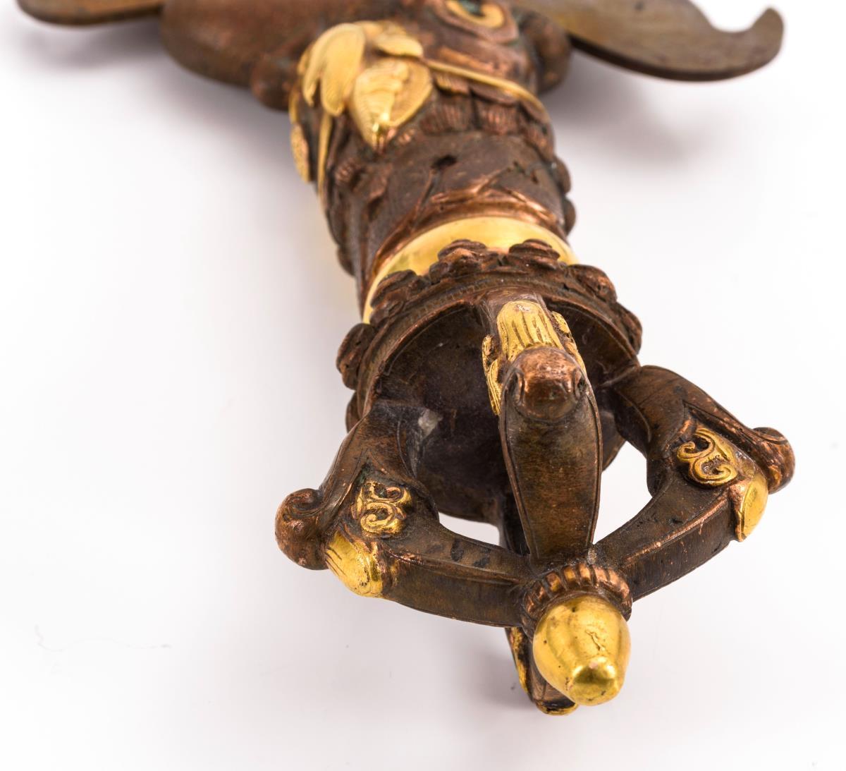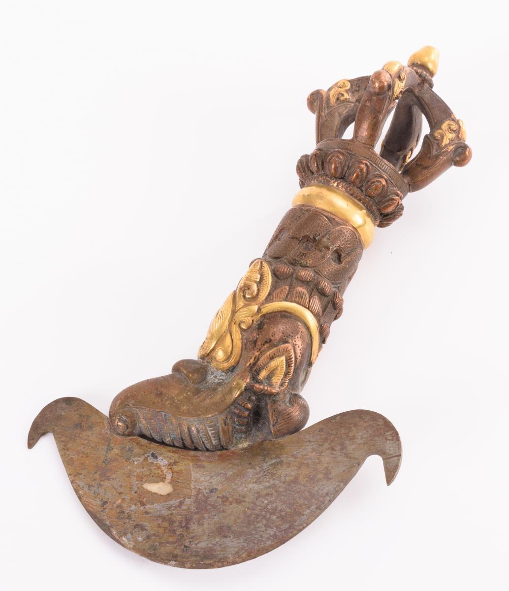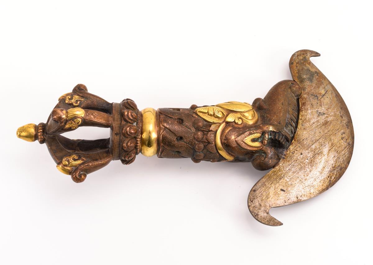 Scharfe, halbrunde Klinge. Massiver Griff mit Vajra-Knauf.