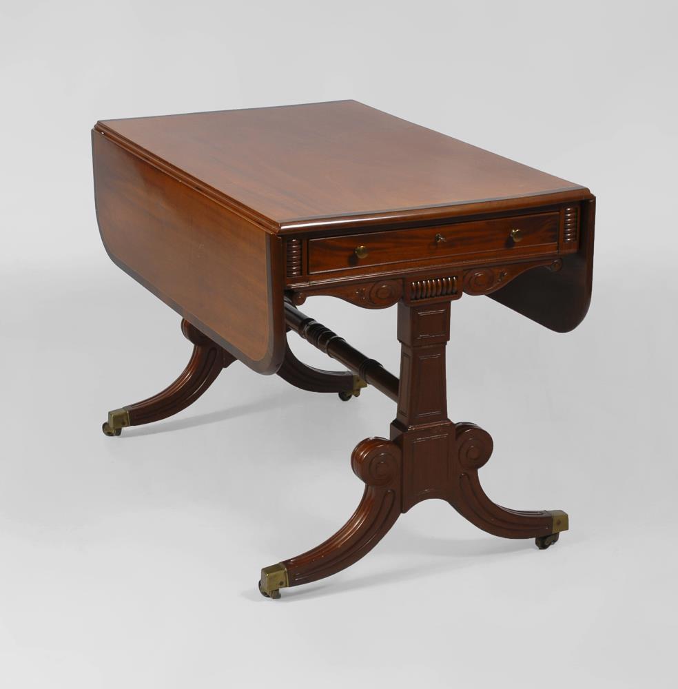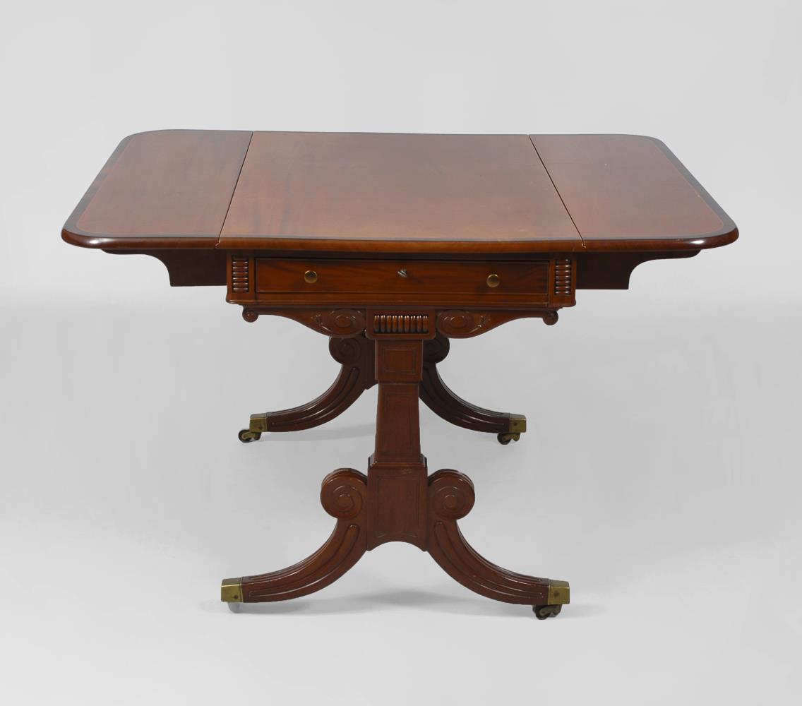 Klappbarer Tisch mit 4 kleinen ausschwenkbaren Armen, 1 Schub und 1 Zierschub, auf 2 Pfeilerbeinen mit volutierten Brückenfüßen und Rollen, gedrechselte Mittelstrebe