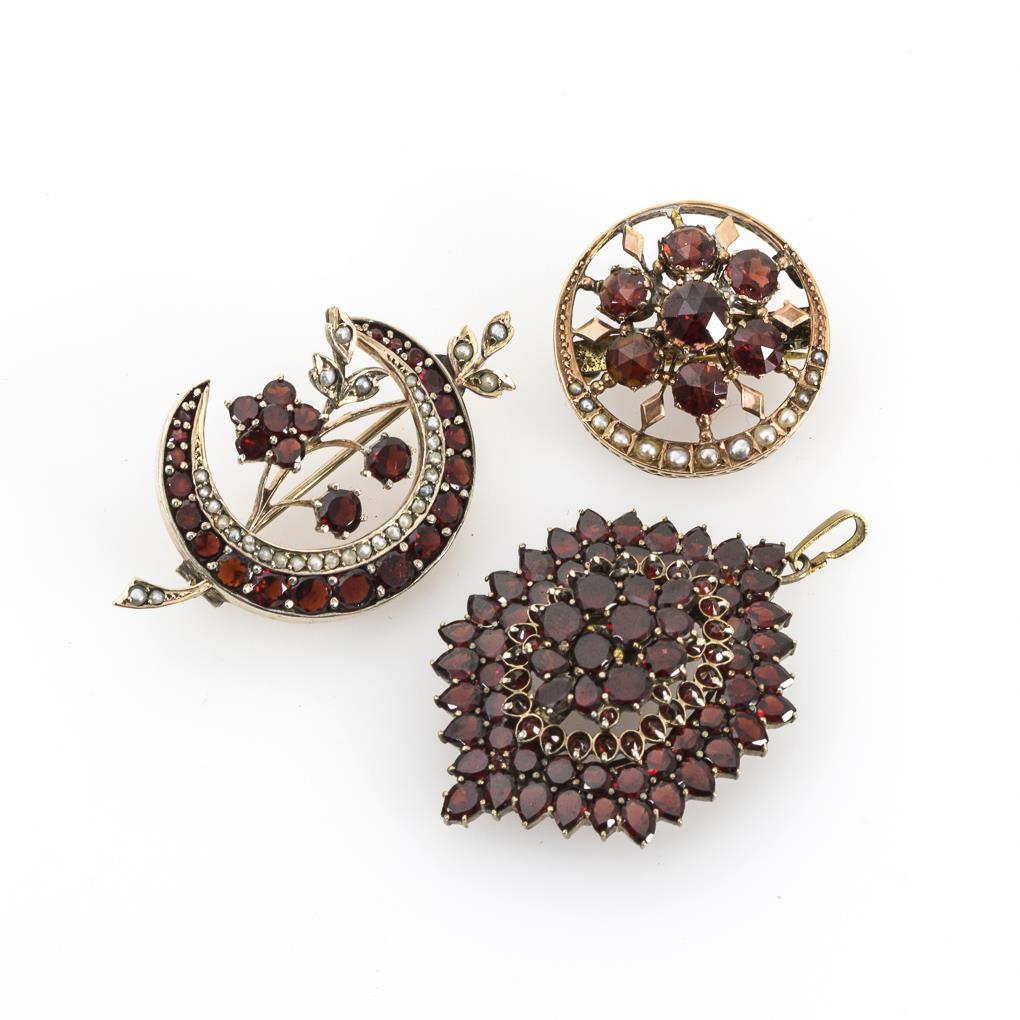 1 Medaillon-Anhänger und 2 Broschen mit Granaten um 1900.