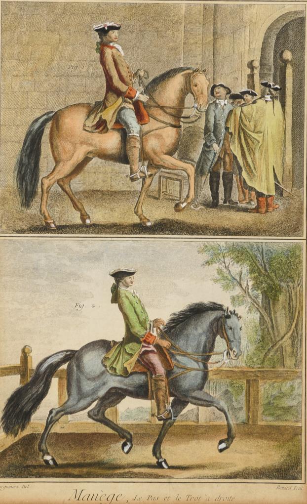 3 Ansichten aus Diderots und d'Alemberts "Encyclopédie ou Dictionnaire raisonné des sciences, des arts et des métiers [...]" (Enzyklopädie oder ein durchdachtes Wörterbuch der Wissenschaften, Künste und Handwerke) zur Reitschule: "Manège, Le Pas et le Trot à droite", "Manège, Terre à Terre à droite. La pesade" und "Manège, Allures defectures, L´Ambe et L´Aubin", gezeichnet von Harguinez, gestochen von Robert Benard. Etwas stockfleckig.