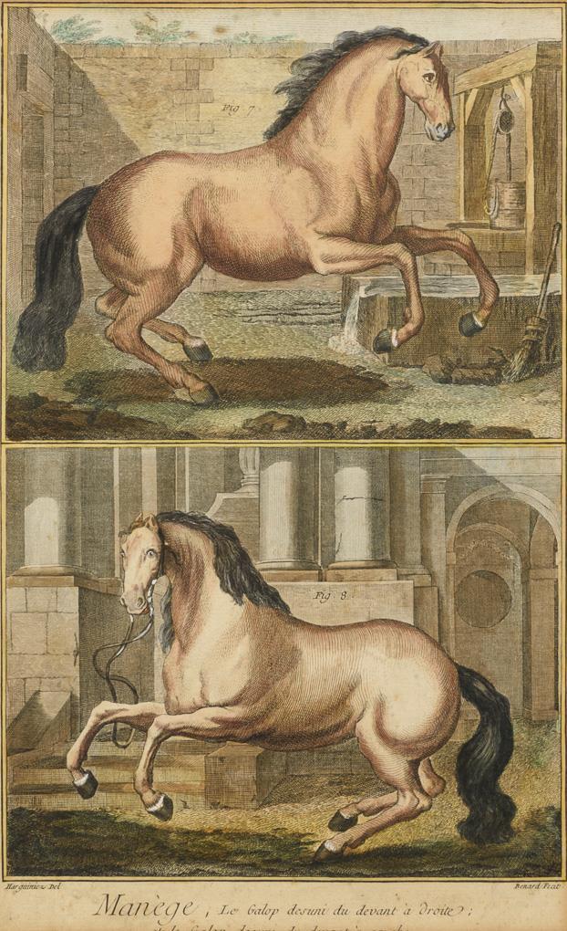 3 Ansichten aus Diderots und d'Alemberts "Encyclopédie ou Dictionnaire raisonné des sciences, des arts et des métiers [...]" (Enzyklopädie oder ein durchdachtes Wörterbuch der Wissenschaften, Künste und Handwerke) zur Reitschule: "Manège, Galop desuni du derriere à gauche et Galop desuni du derriere à droite", "Manège, Le Galop à droite et le Galop faux à droite" und "Manège, Le Galop desuni du devant à droite; et le Galop desuni du devant à gauche", gezeichnet von Harguinez, gestochen von Robert Benard. Etwas stockfleckig.