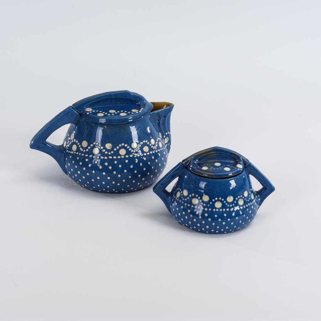 Kanne und Zuckerdose mit spitzwinkligen Henkeln, jeweils mit Deckel. Deckelkanne partiell leicht gechipped.