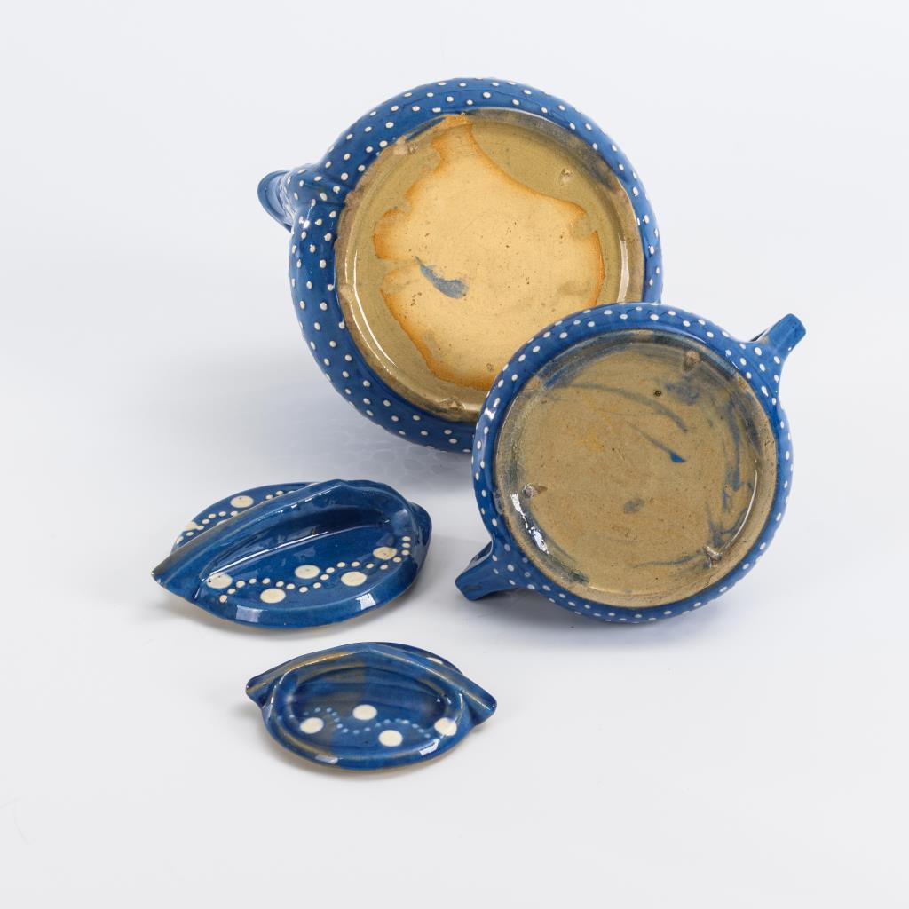 Irdenware, blaue Glasur, weißer Malhörnchendekor mit Punkten, innen ockerbraun glasiert.H 11,5 und 15 cm.