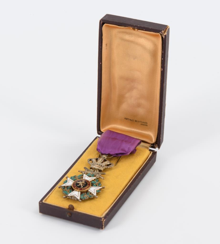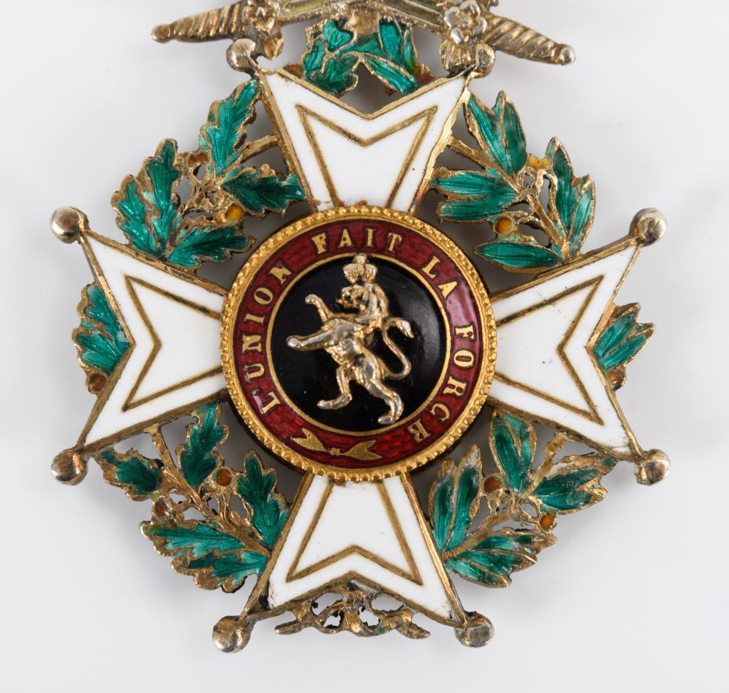 Johanniterkreuz mit belgischem Löwen und Umschrift "L’UNION FAIT LA FORCE", verso Monogramm LR. Königskrone mit gekreuzten Schwertern. Schatulle "Arthus Bertrand Paris" gemarkt. Geringe Emailabplatzer, defekte Schatulle.