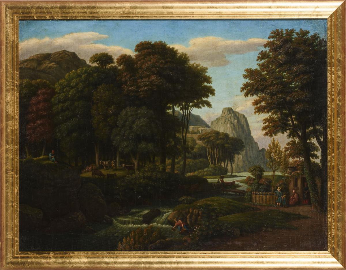 Gebirgslandschaft mit Dorfbewohnern und Vieh an einem Fluss. Leinwand doubliert.