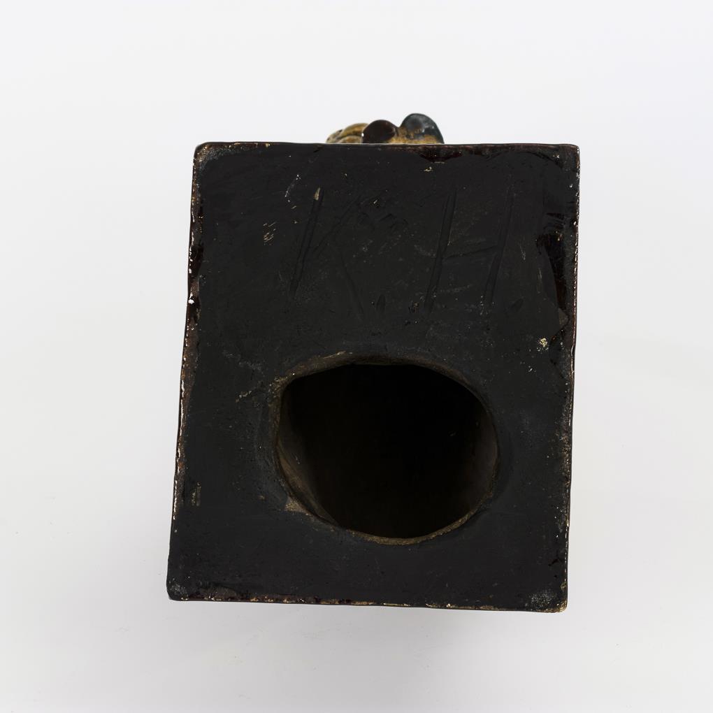 Heller Scherben, blau und braun glasiert. H 32 cm.