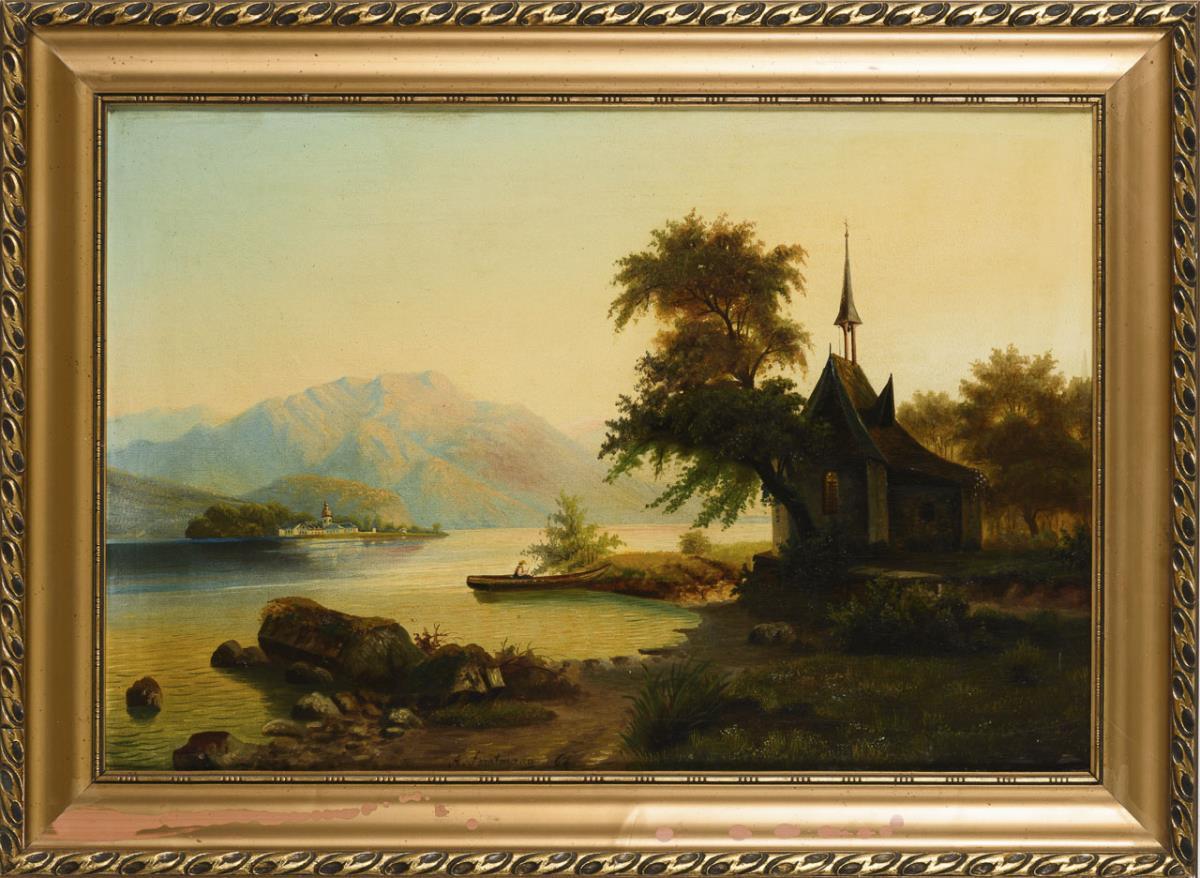 Wohl Ansicht des Chiemsees mit der Fraueninsel und einer kleinen Kapelle am Ufer. Leichte Altersspuren.